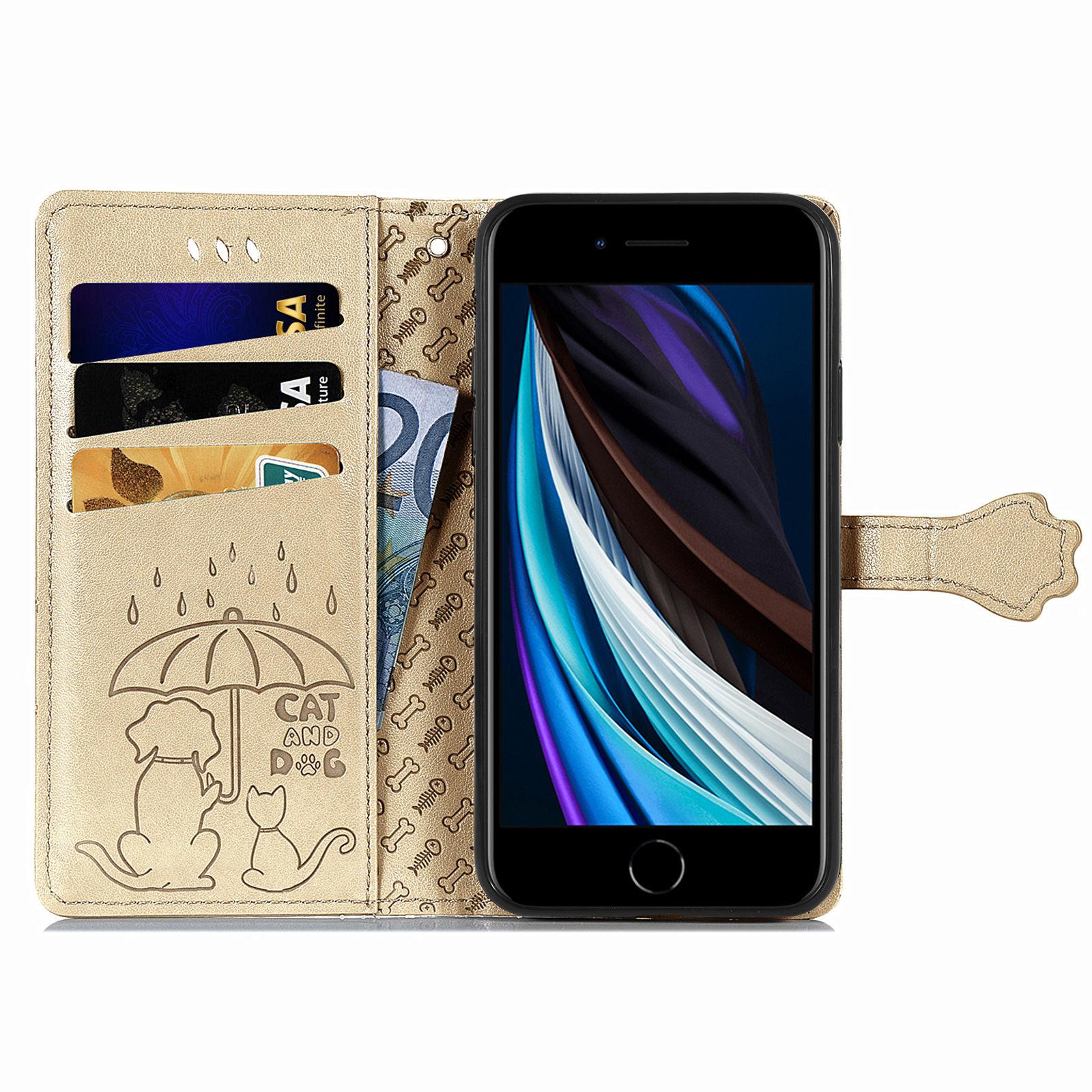 For iPhone 16e Cat and Dog Embossed Leather Phone Case(Gold)
