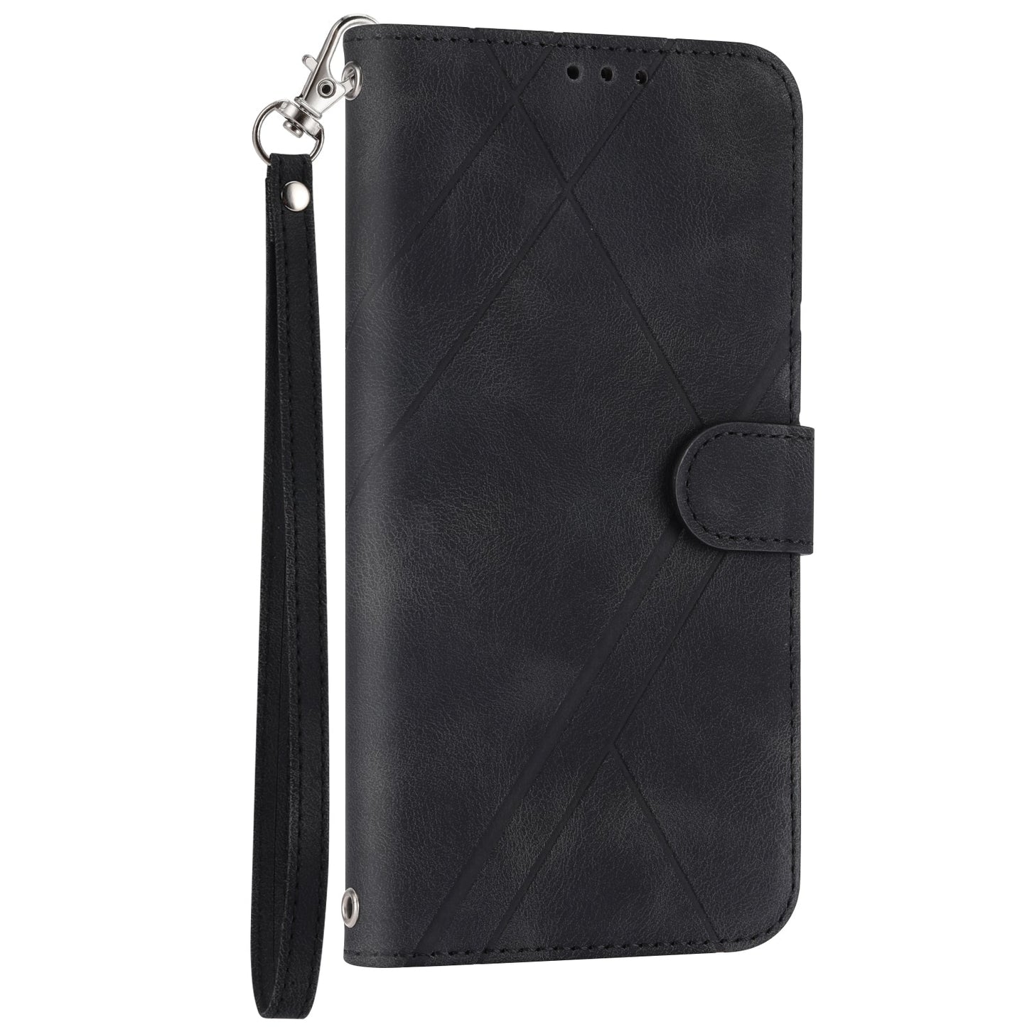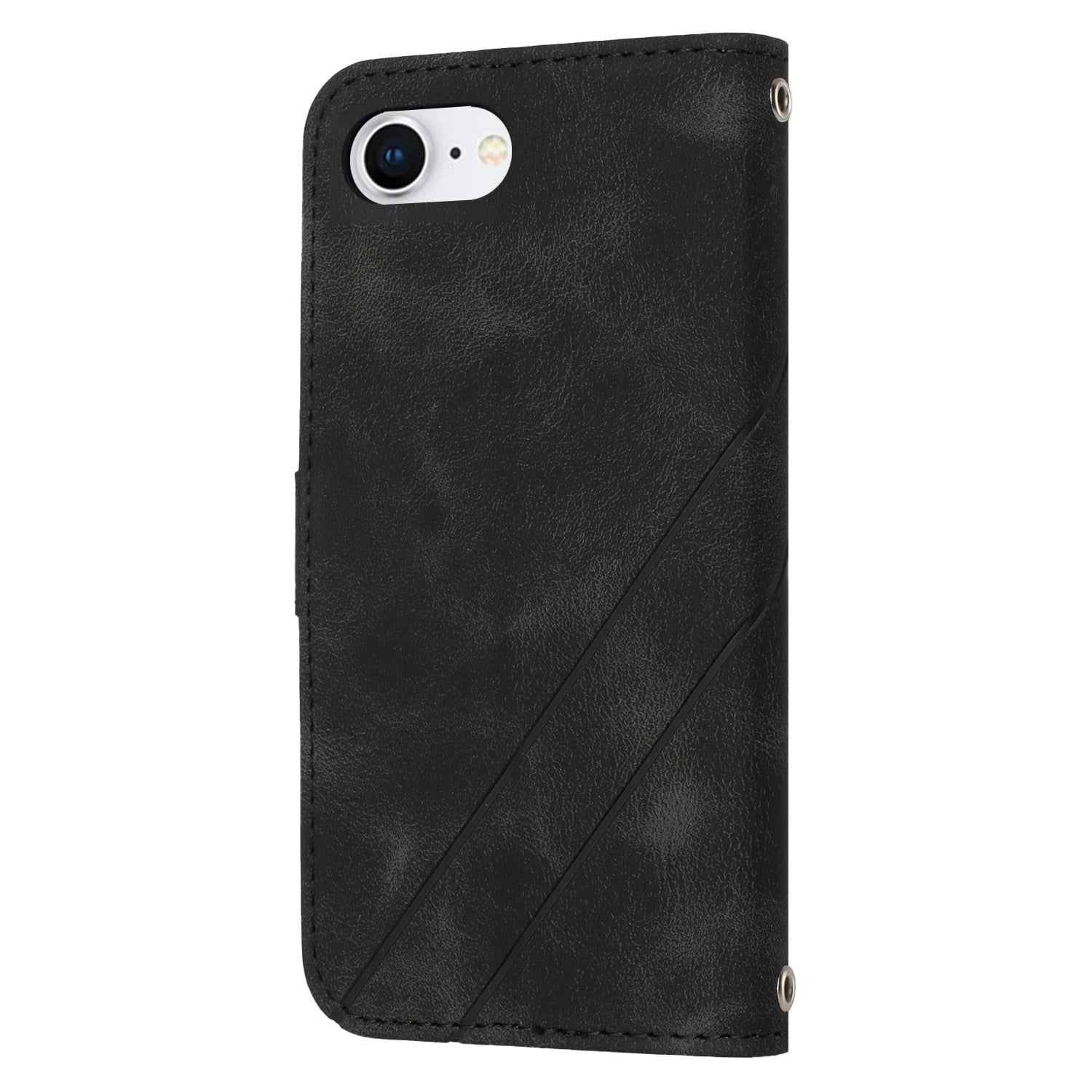 For iPhone 16e Embossed Line Leather Phone Case with Lanyard(Black)