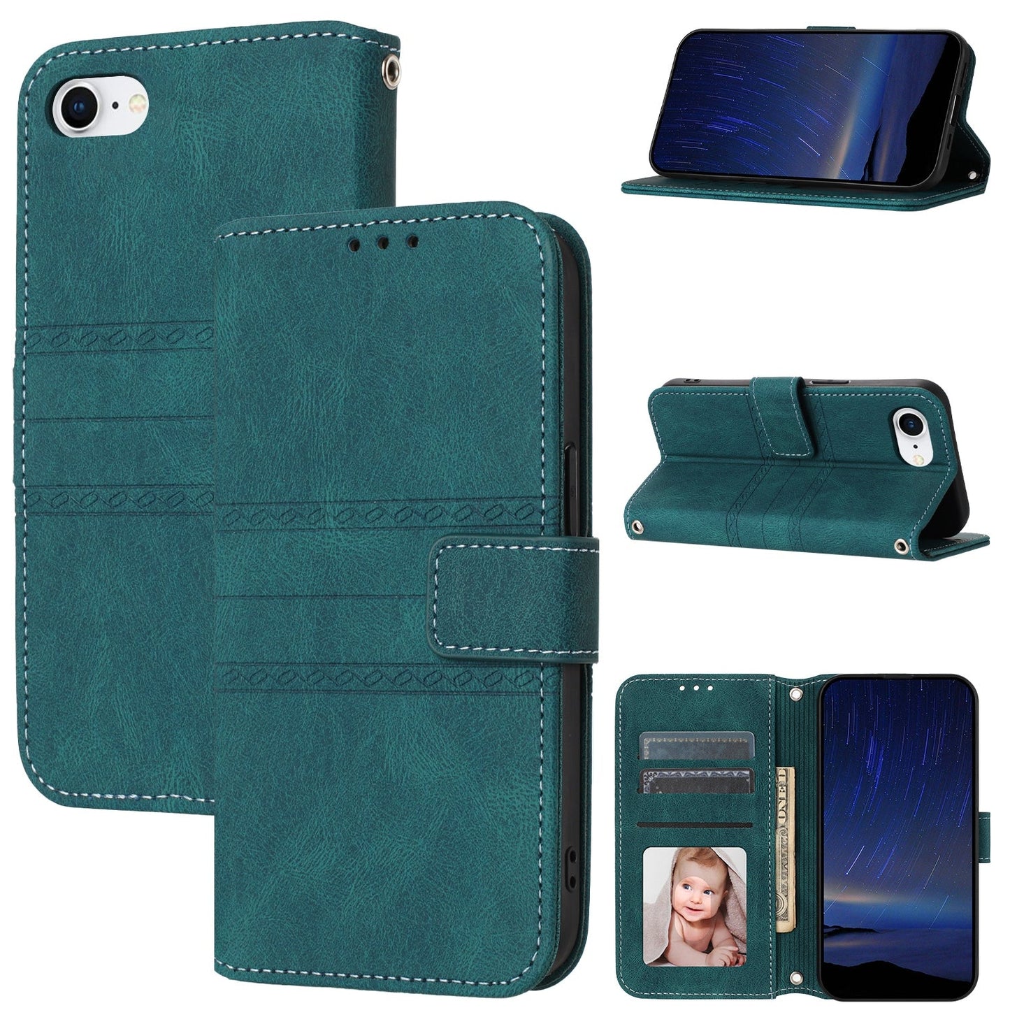For iPhone 16e Embossed Stripes Skin Feel Leather Phone Case(Dark Green)
