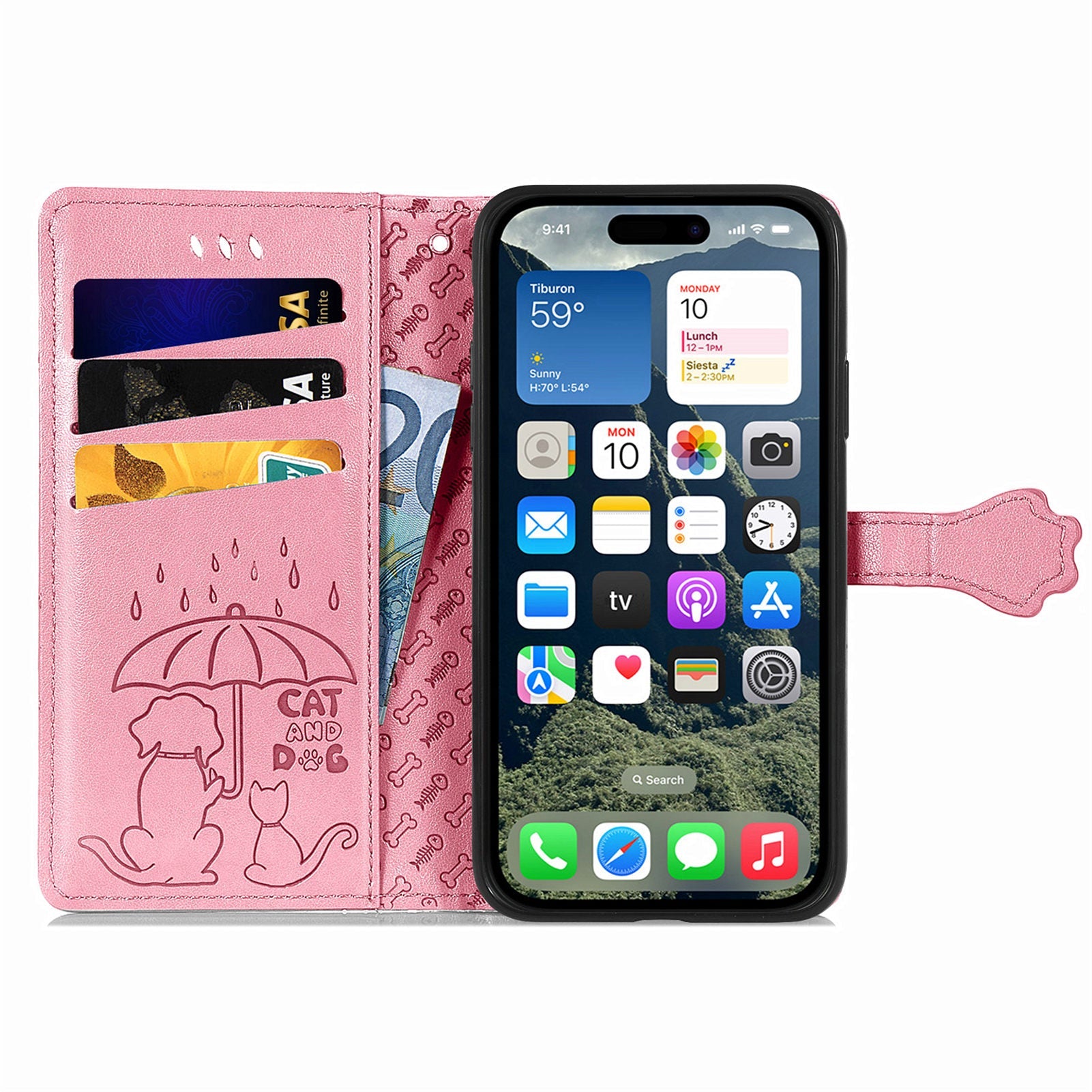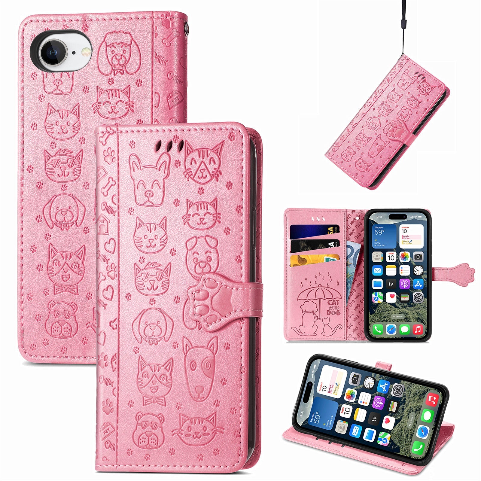 For iPhone 16e Leather Wallet Case Flip Phone Cover with Cute Cat Dog Pattern - Pink