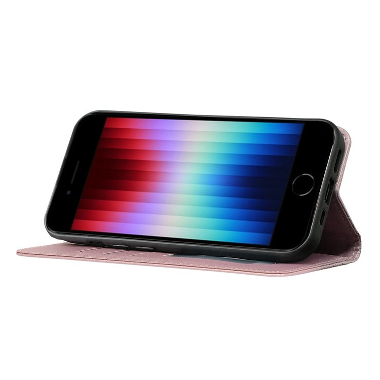 For iPhone 16e Wallet Phone Case Strong Magnetic Checkered Pattern Imprint Leather Flip Cover - Rose Gold
