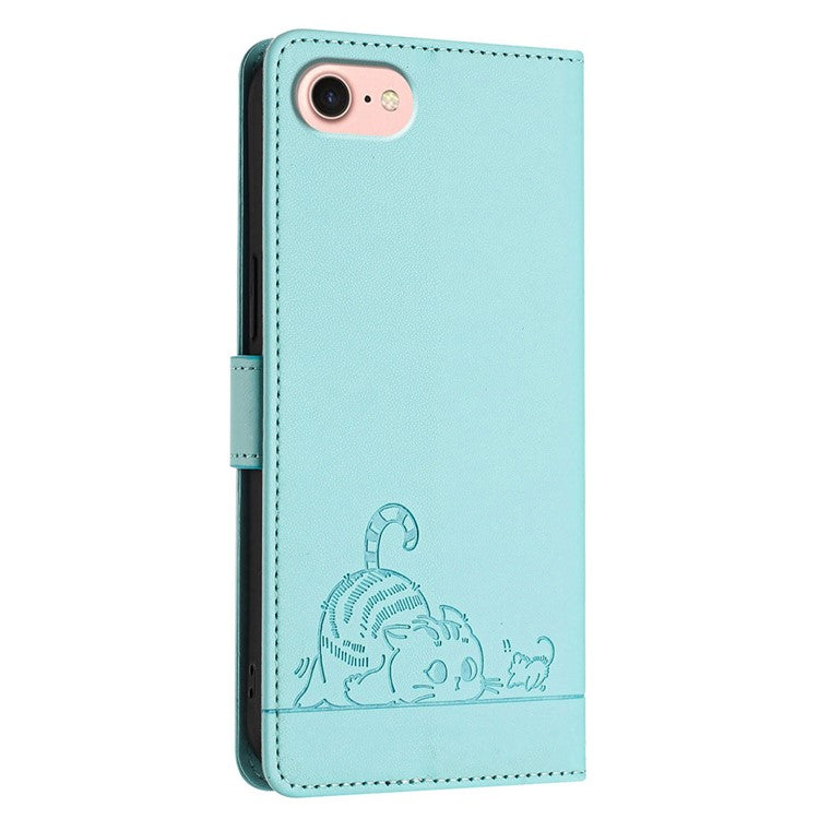 YB Imprinting Series-9 for iPhone SE (2025) Case Cat Mouse Pattern RFID Blocking Leather Cover - Mint Green