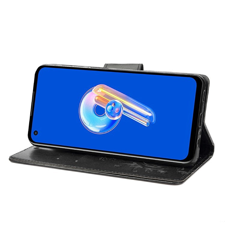 For Asus Zenfone 9 5G PU Leather Wallet Case Imprinting Flower Butterflies Magnetic Closure Stand Flip Cover with Strap - Black