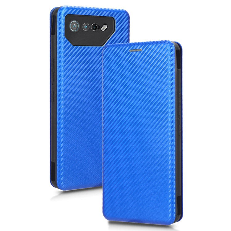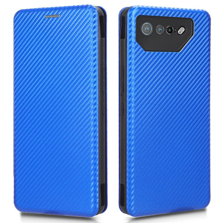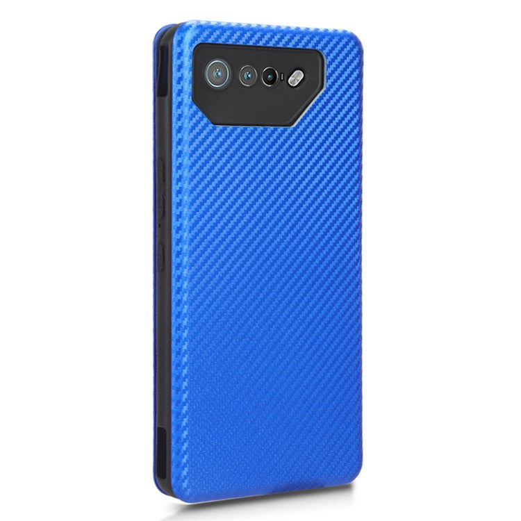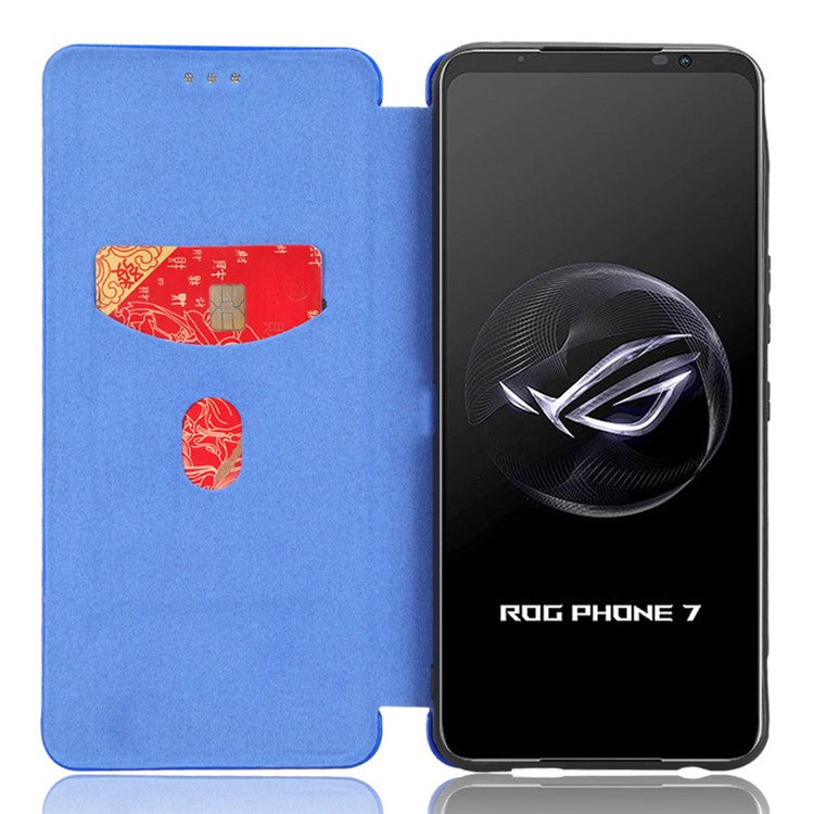 Stand Cover for Asus ROG Phone 7 5G / 7 Ultimate 5G Carbon Fiber Texture Card Slot PU Leather Phone Case - Blue