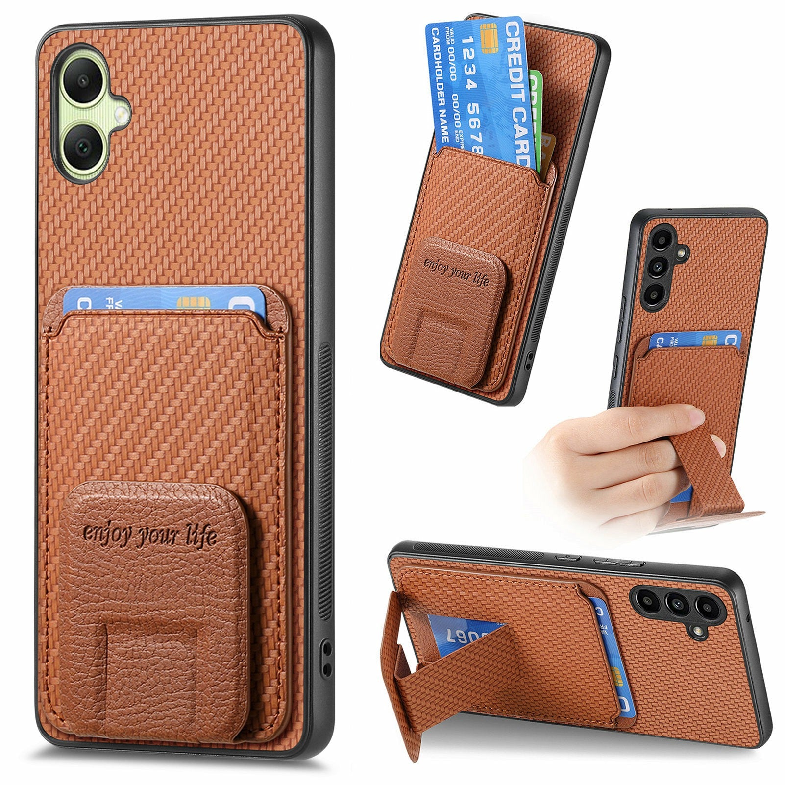 For Samsung Galaxy A06 Case Card Holder Carbon Fiber Texture Leather Coated TPU Phone Cover - Brown