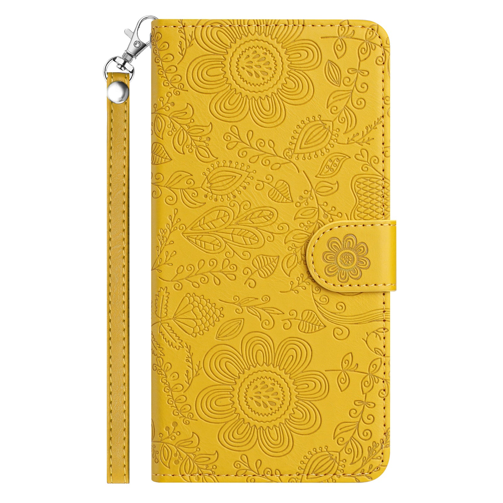 For Samsung Galaxy A06 Case Flower Imprint Leather Flip Wallet Phone Cover with Wrist Strap - Yellow