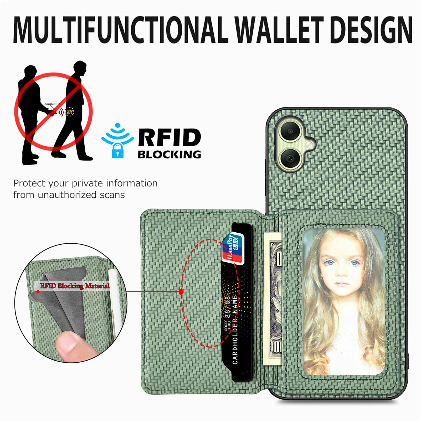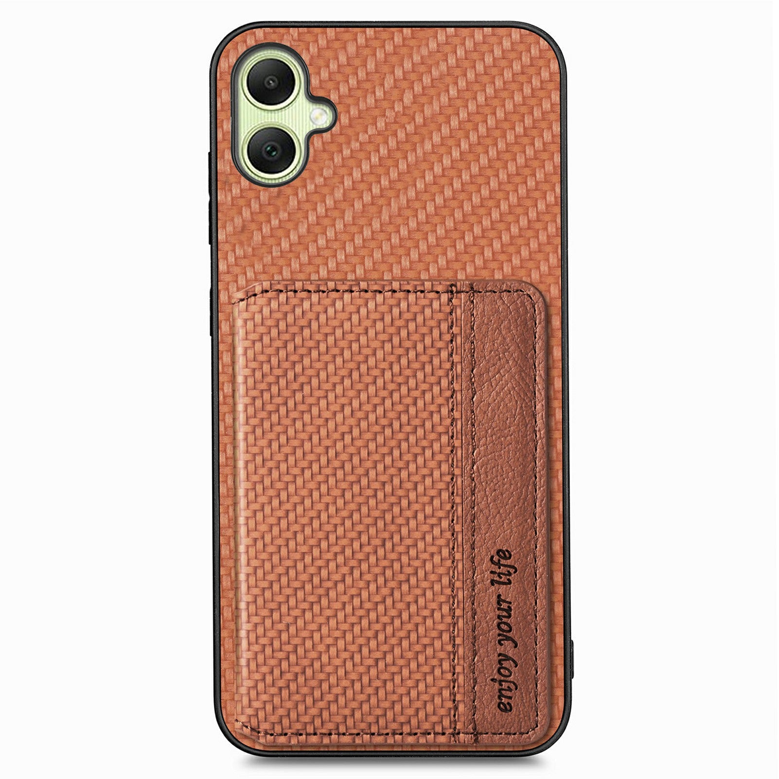For Samsung Galaxy A06 Case RFID Blocking Card Holder Carbon Fiber Leather+PC+TPU Phone Cover - Brown