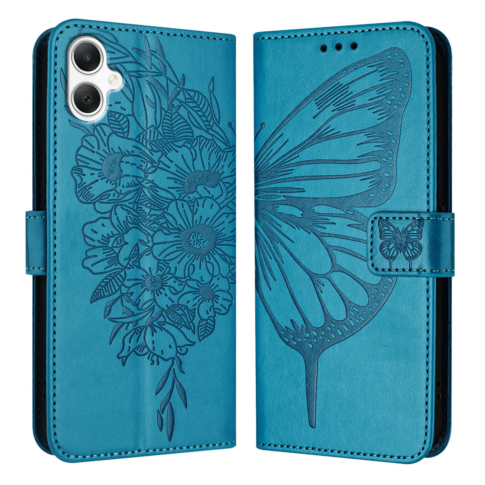 For Samsung Galaxy A06 Case YB Imprinting Series-4 Butterfly Flower Flip Wallet Leather Phone Cover - Blue