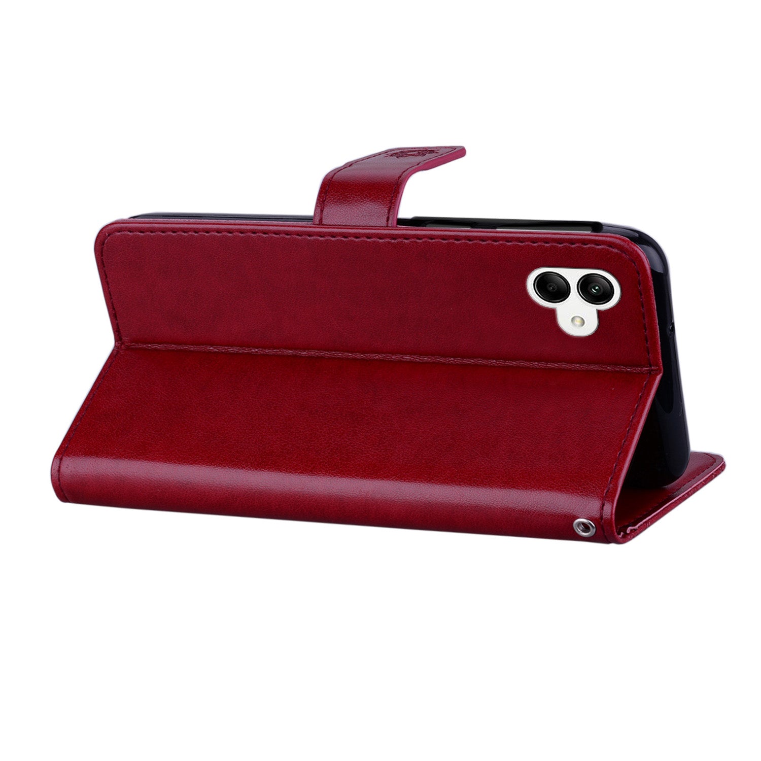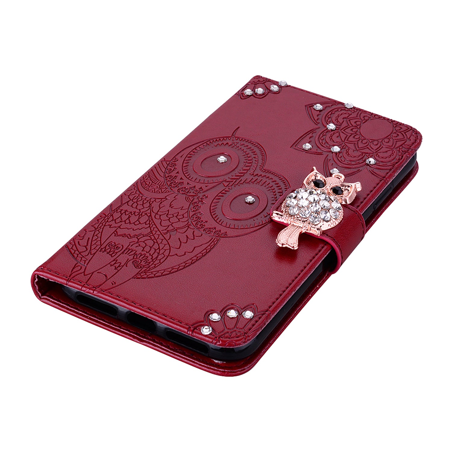 For Samsung Galaxy A06 Wallet Case Owl Flower Imprinted Rhinestone Leather Cover - Red