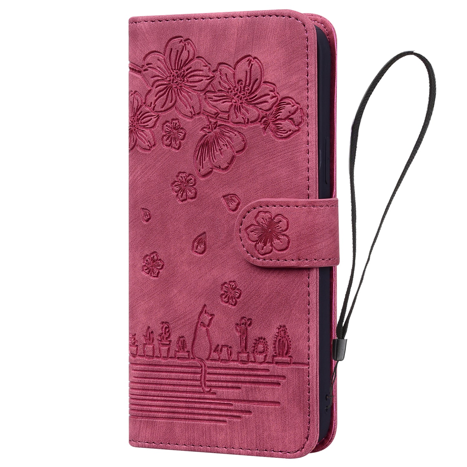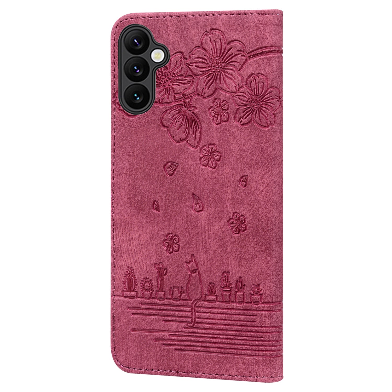 For Samsung Galaxy A16 5G / A16 4G Case Flip Stand Leather Phone Cover Cherry Blossom Cat Imprinted - Wine Red