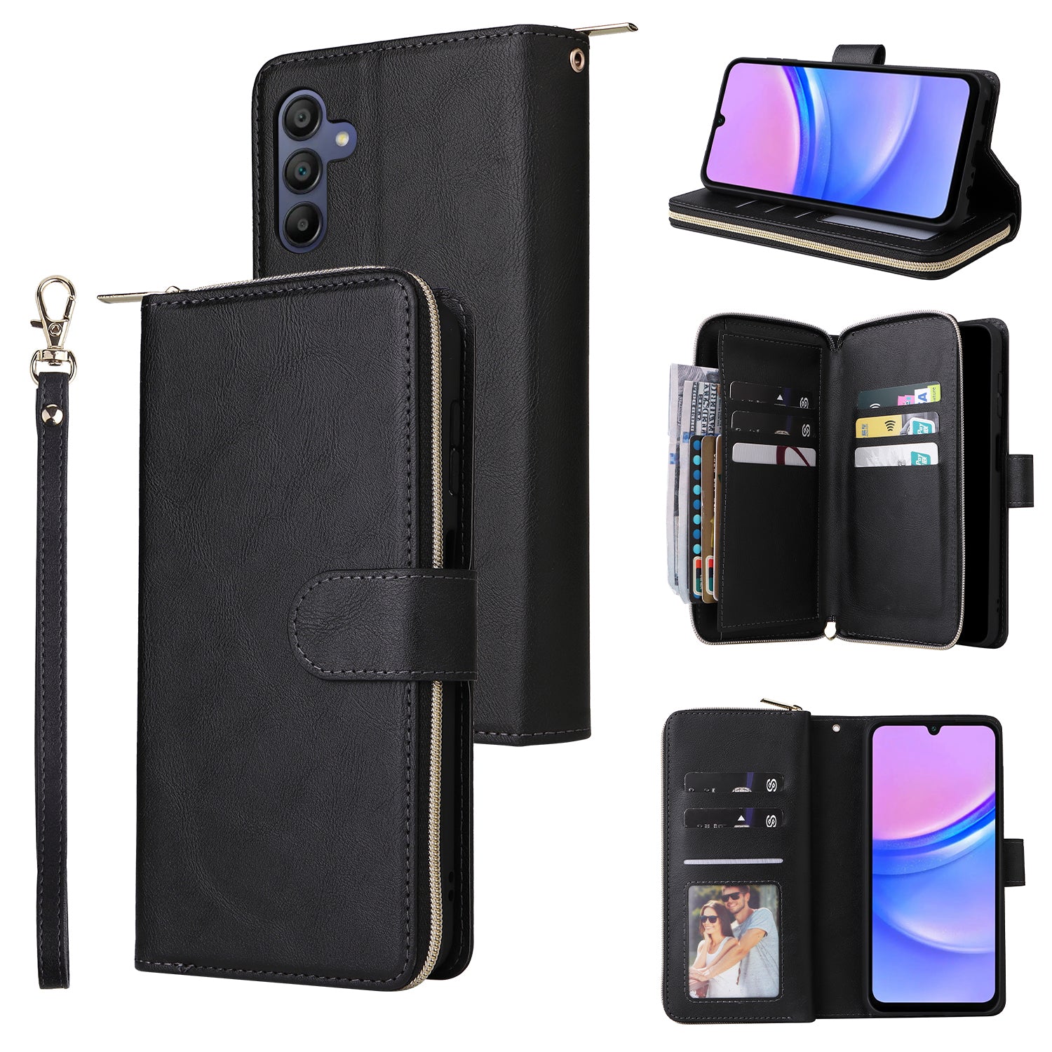 For Samsung Galaxy A16 5G / A16 4G Case Zipper Pocket PU Leather Phone Cover with Hand Strap - Black