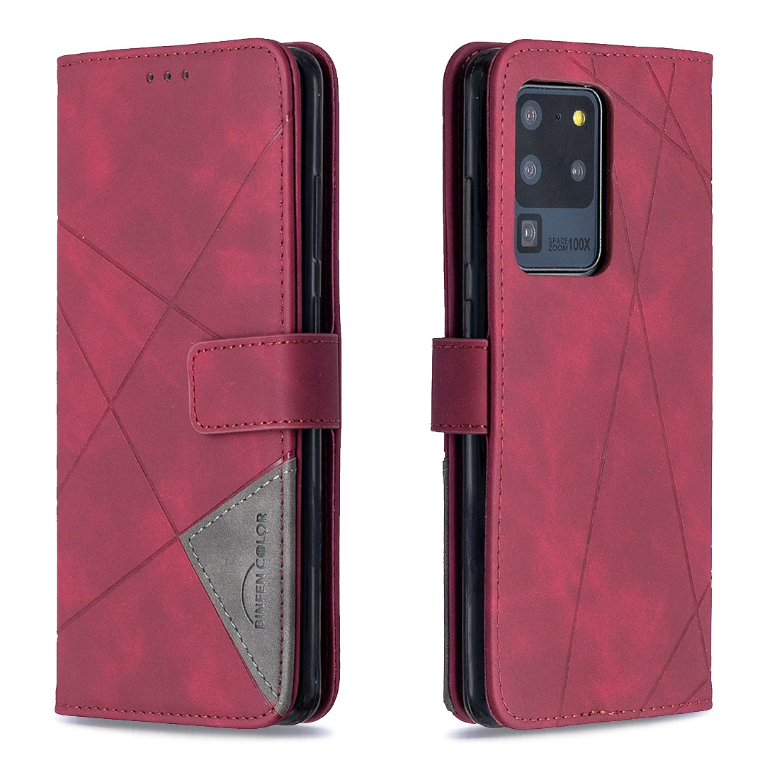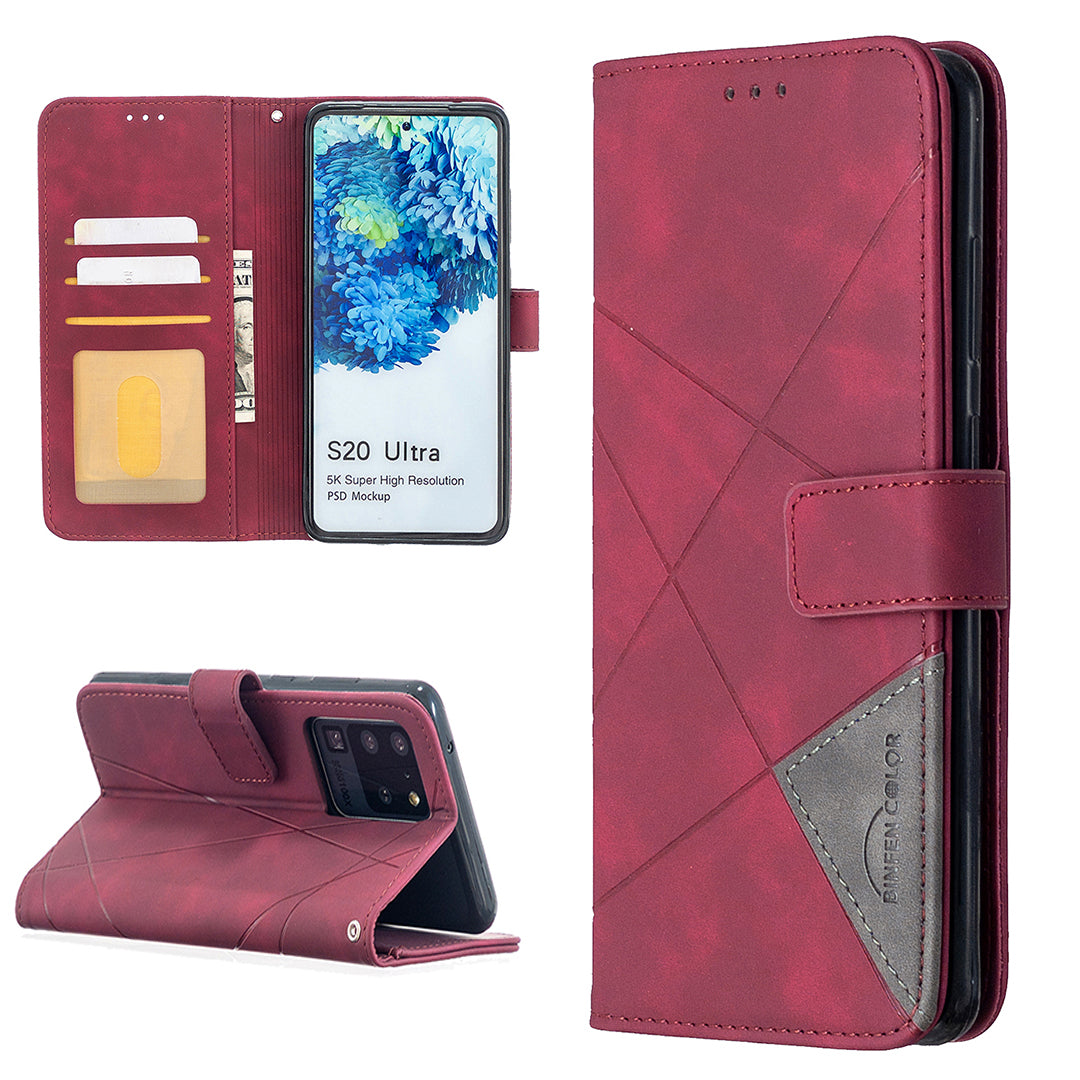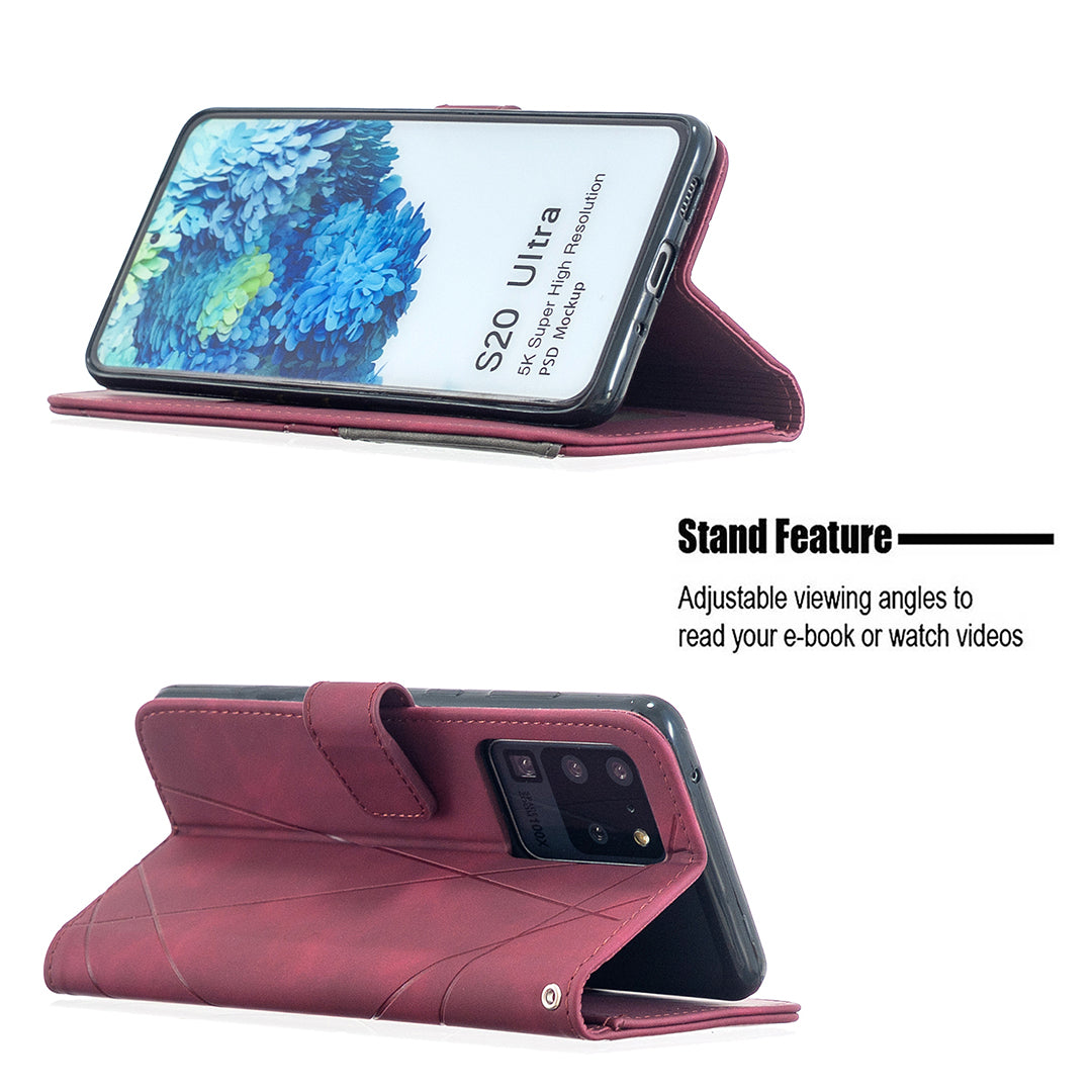 BF05 Leather Case Geometric Texture Wallet Stand Phone Shell for Samsung Galaxy S20 Ultra - Wine Red