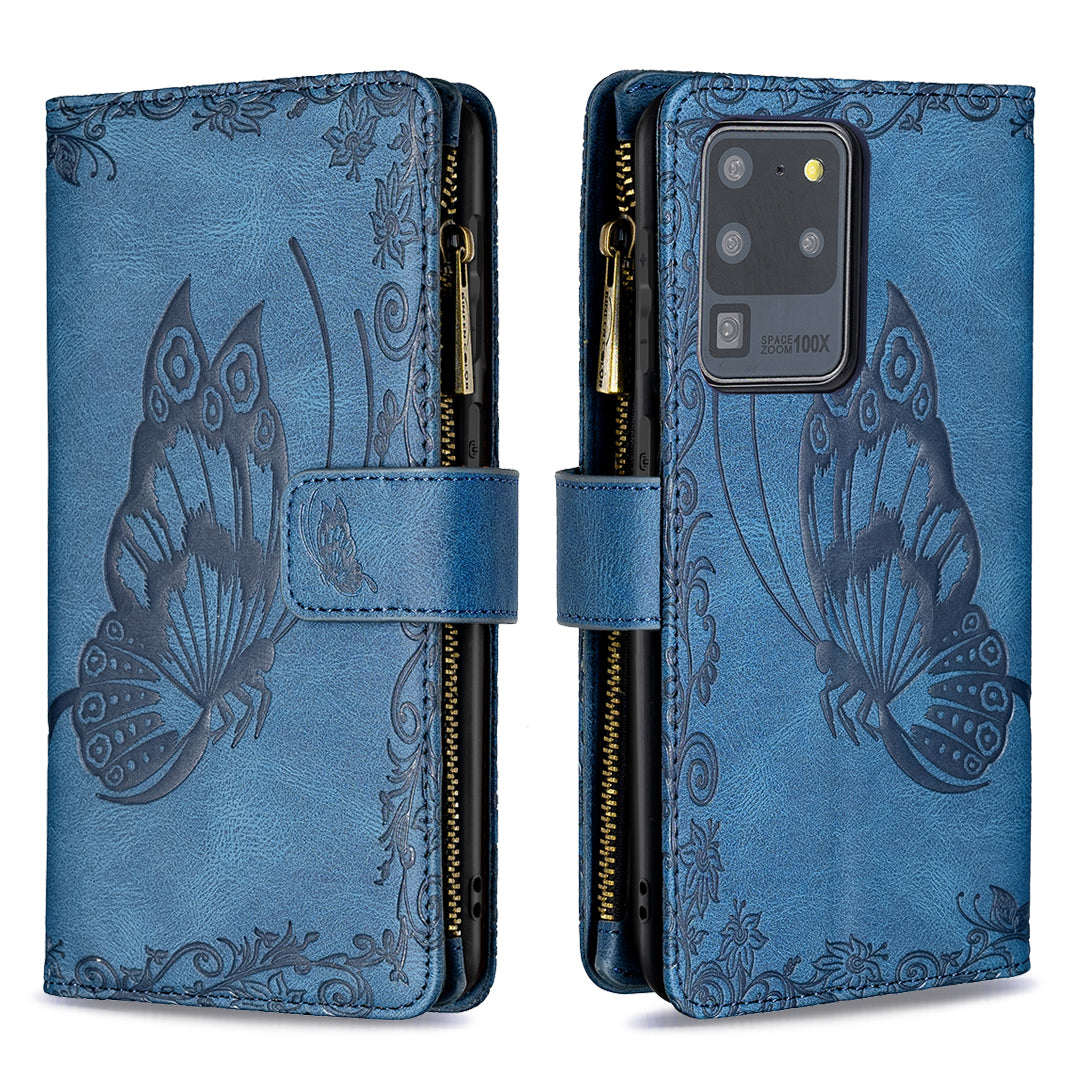 PU Leather Wallet Case for Samsung Galaxy S20 Ultra, Zipper Pocket Pattern Stand Flip Phone Cover - Blue