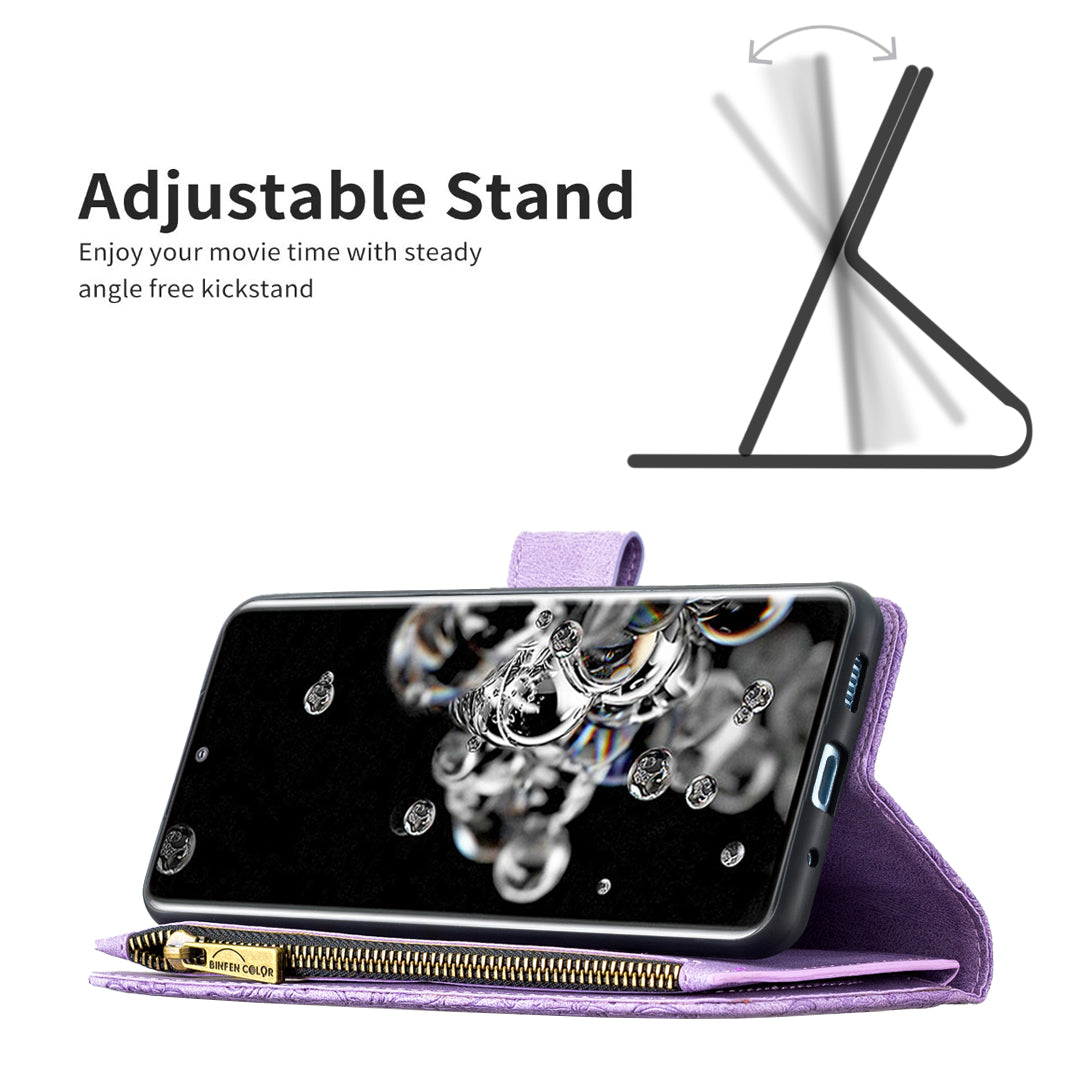 PU Leather Wallet Case for Samsung Galaxy S20 Ultra, Zipper Pocket Pattern Stand Flip Phone Cover - Purple