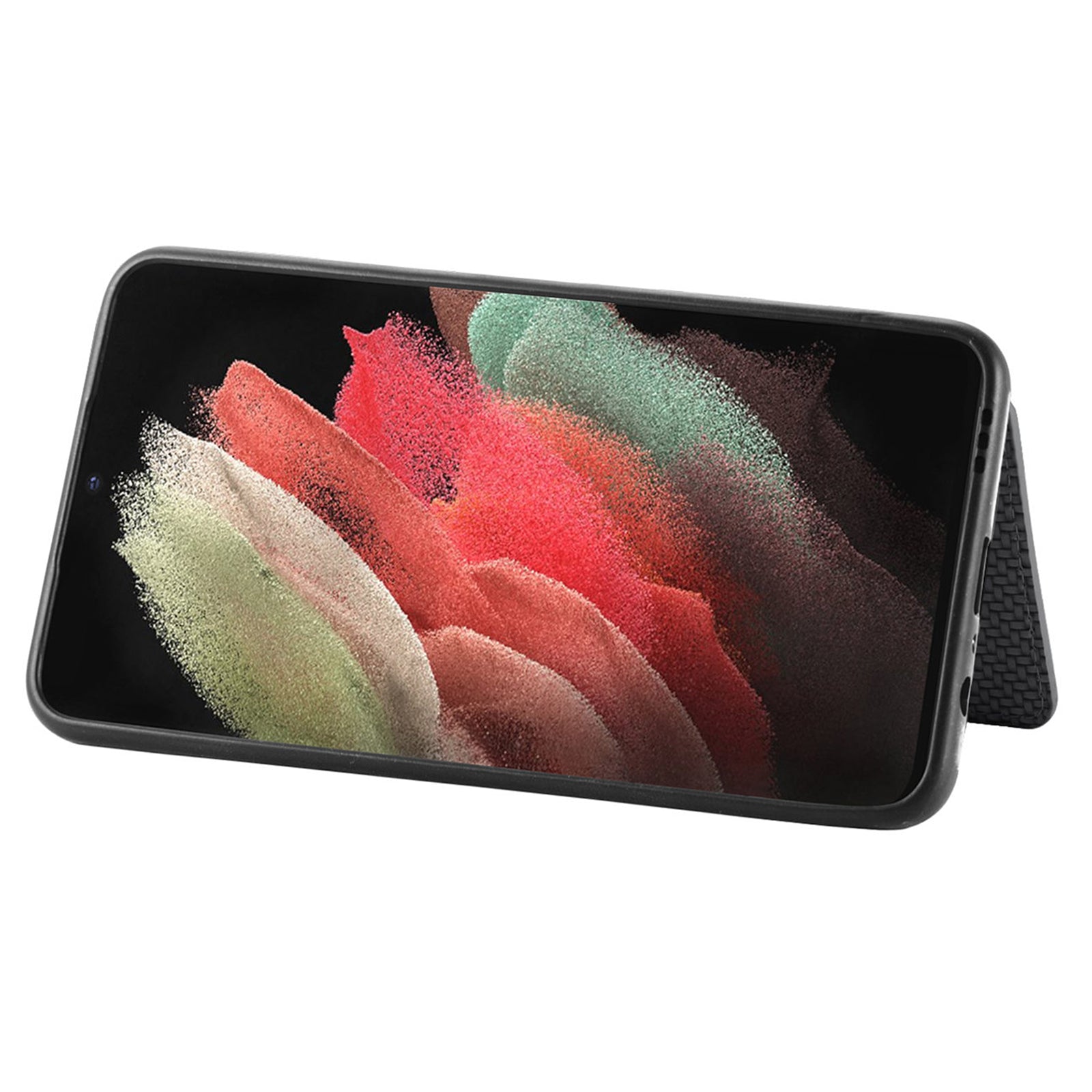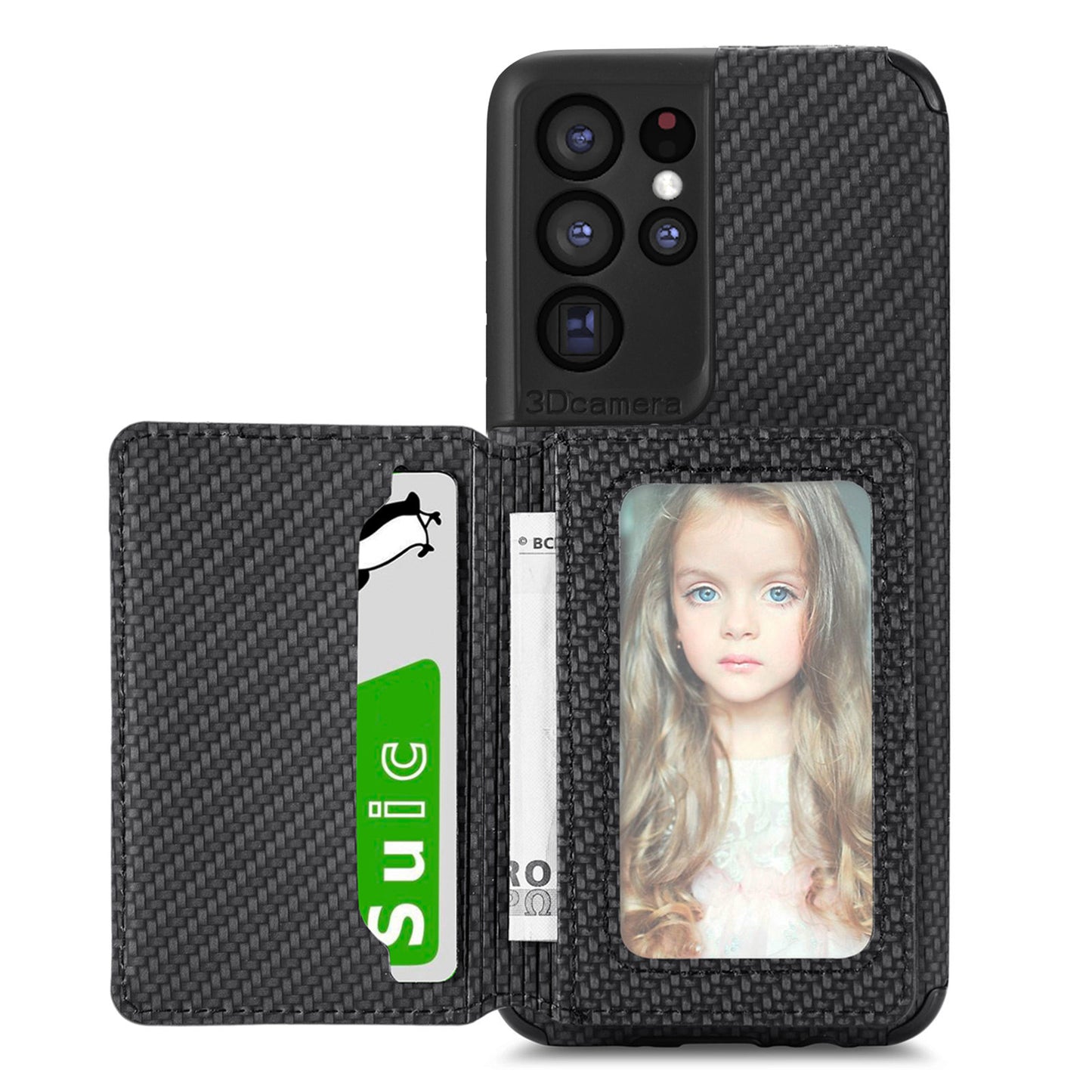 Quality Leather and TPU Phone Case Carbon Fiber Texture Anti-Drop Card Holder Design Built-in Magnet Metal Sheet Phone Cover with Kickstand for 	Samsung Galaxy S20 Ultra - Black