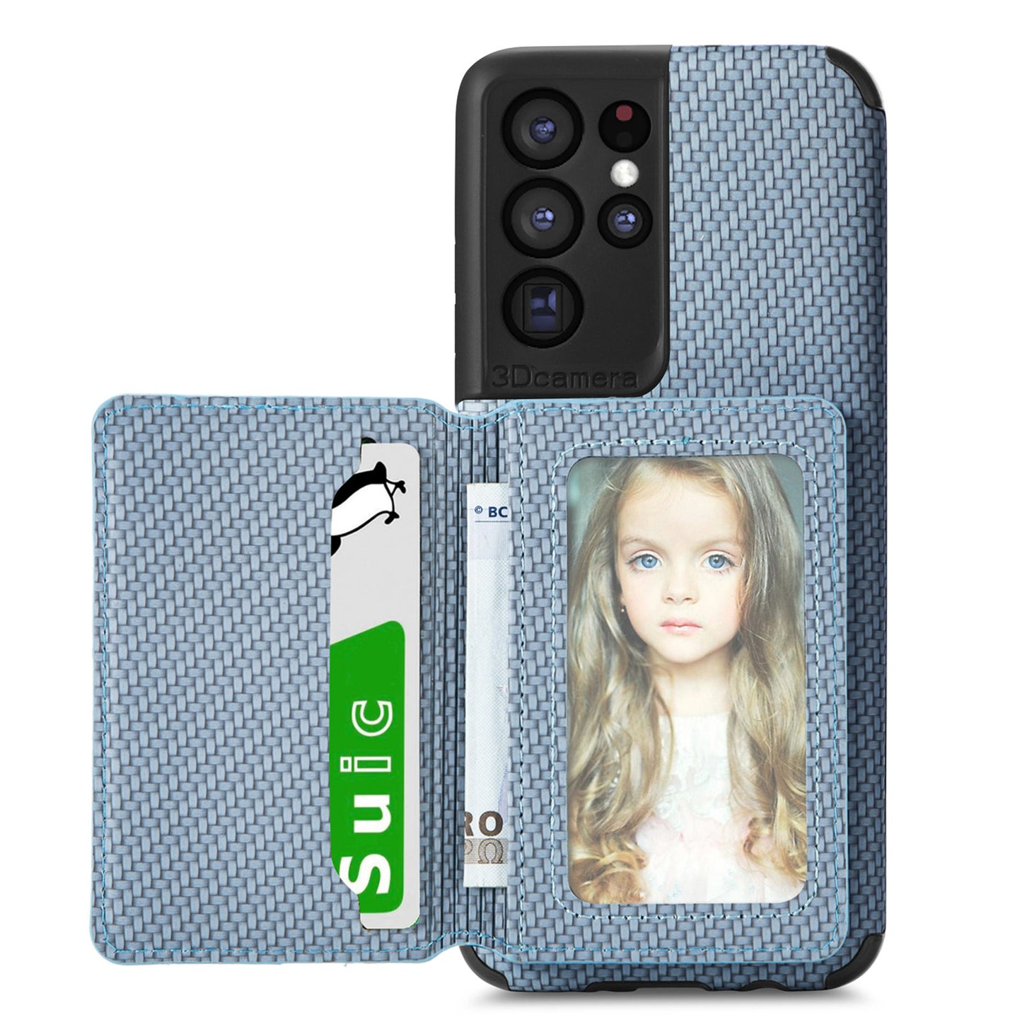 Quality Leather and TPU Phone Case Carbon Fiber Texture Anti-Drop Card Holder Design Built-in Magnet Metal Sheet Phone Cover with Kickstand for 	Samsung Galaxy S20 Ultra - Blue