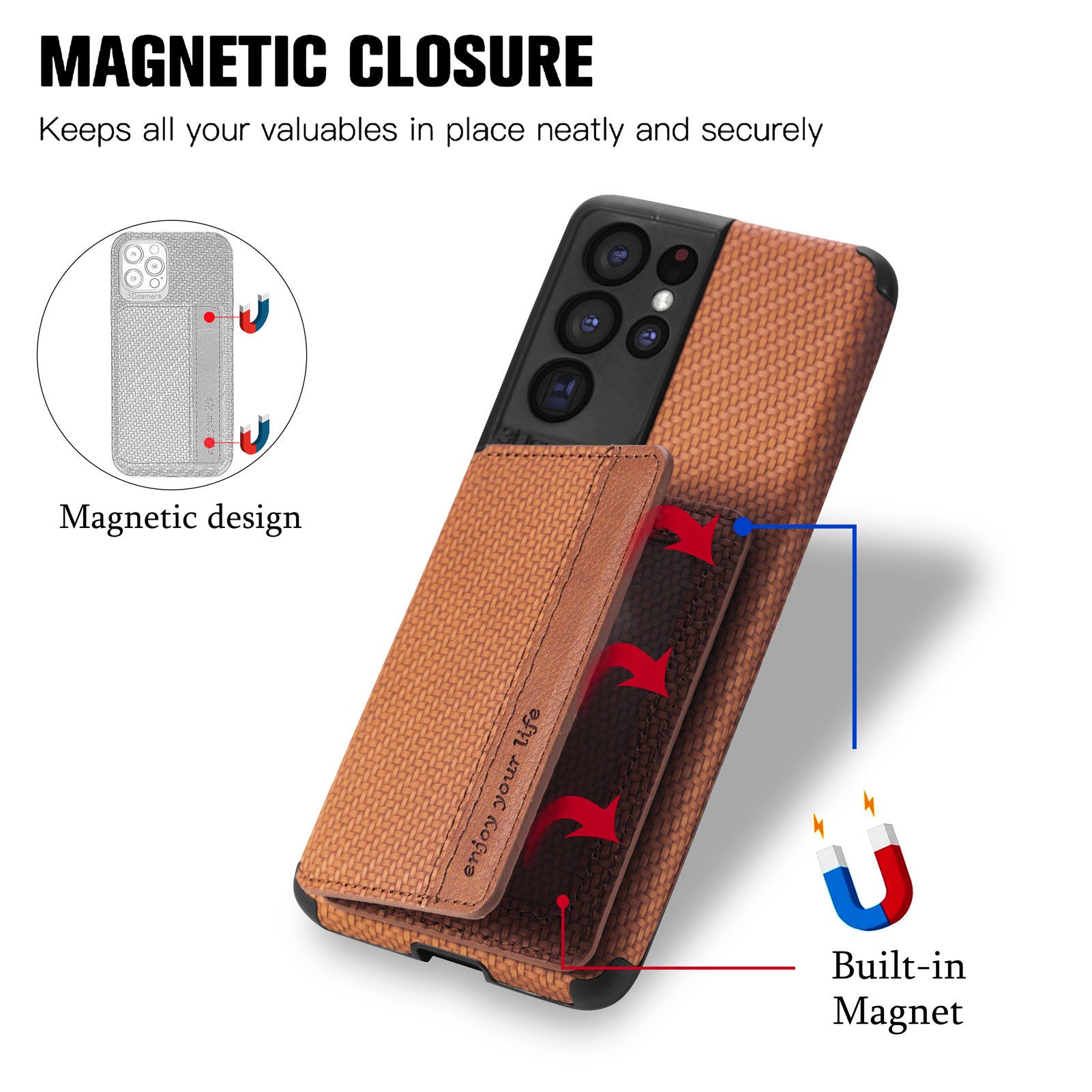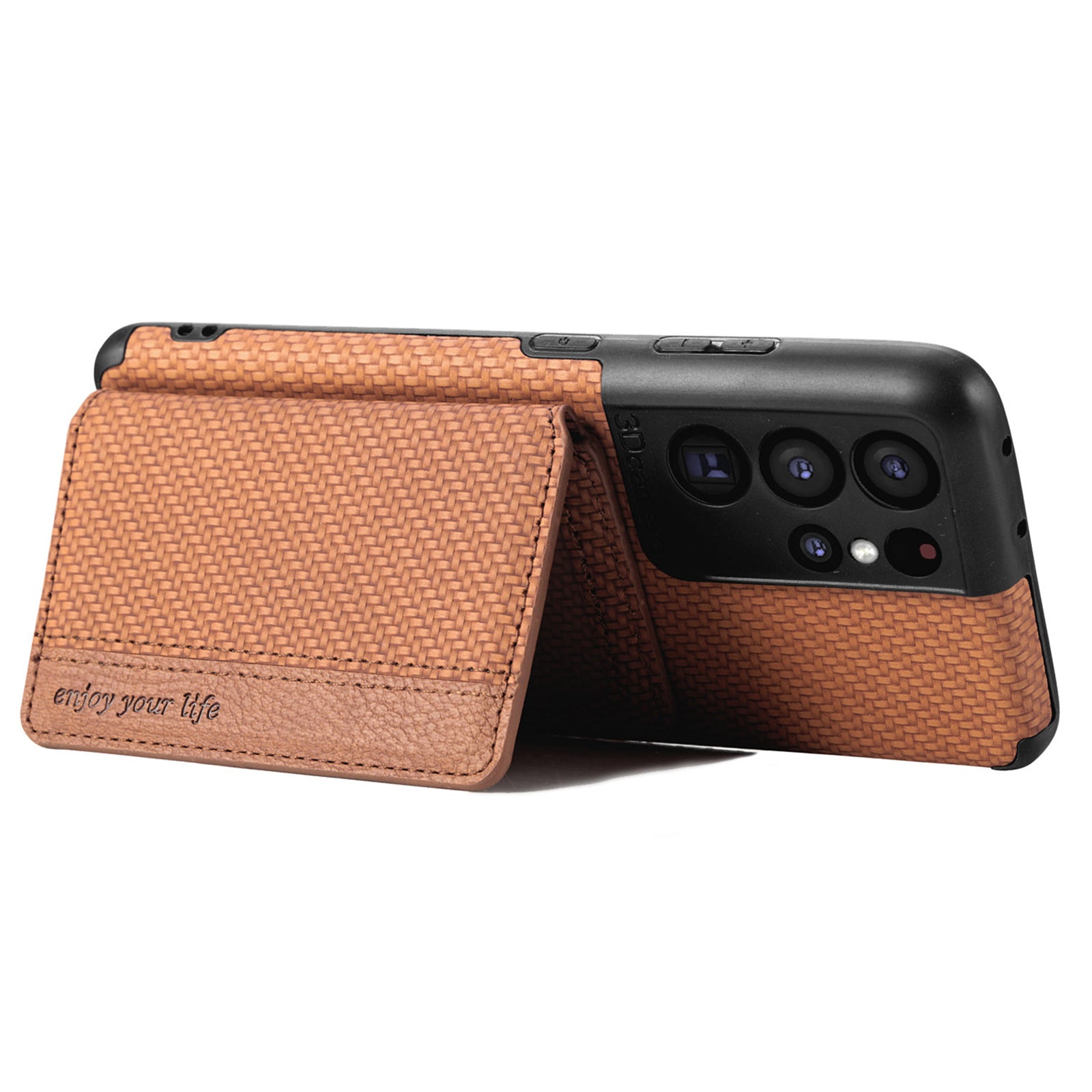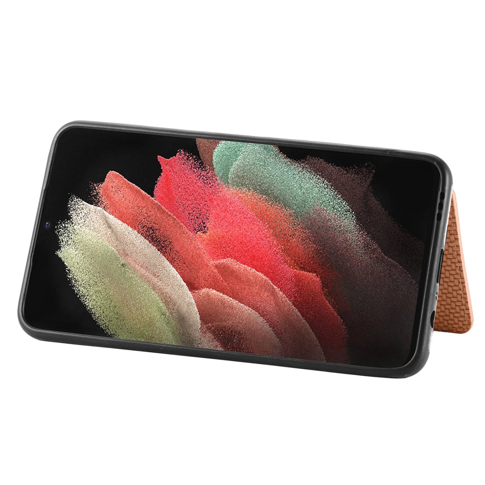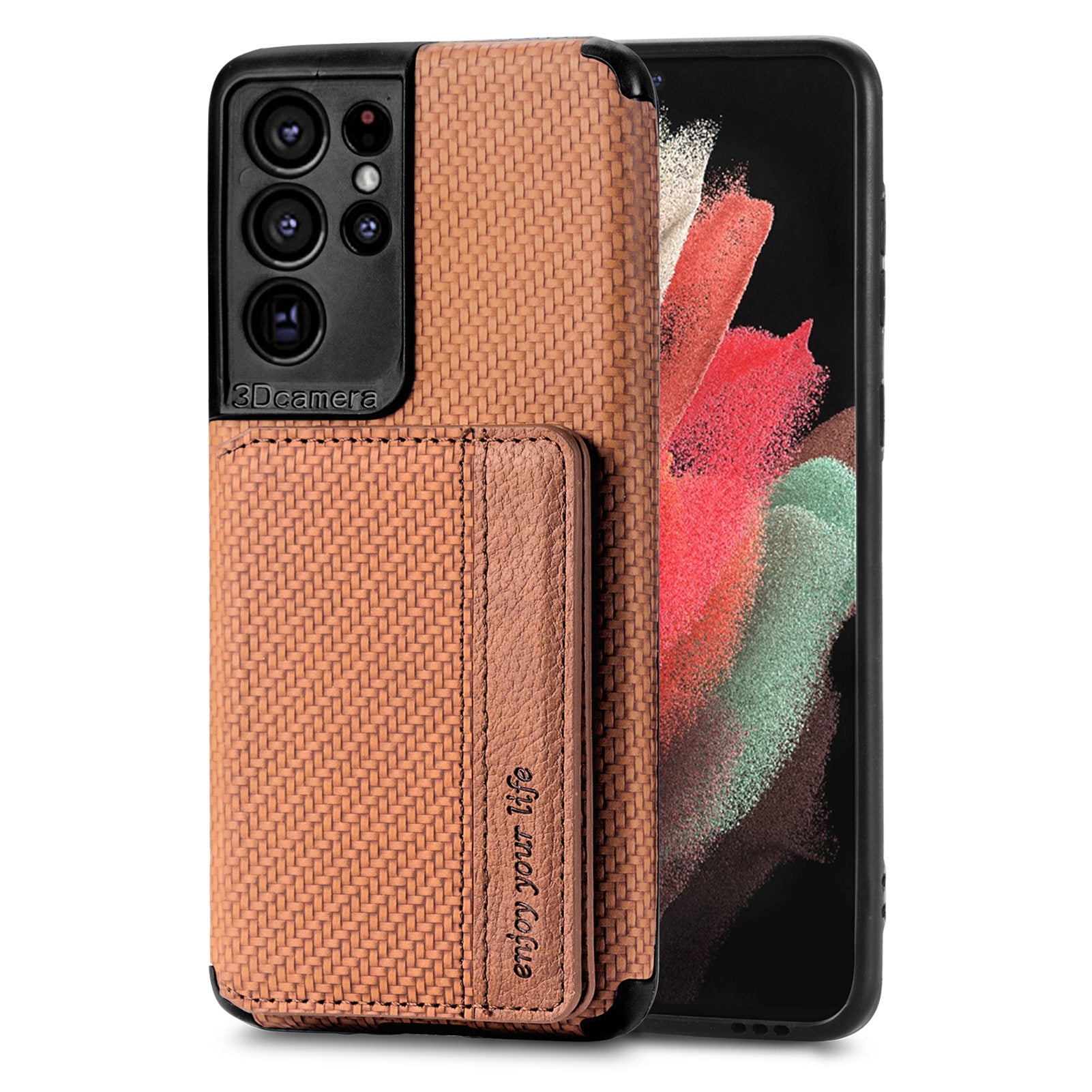 Quality Leather and TPU Phone Case Carbon Fiber Texture Anti-Drop Card Holder Design Built-in Magnet Metal Sheet Phone Cover with Kickstand for 	Samsung Galaxy S20 Ultra - Brown