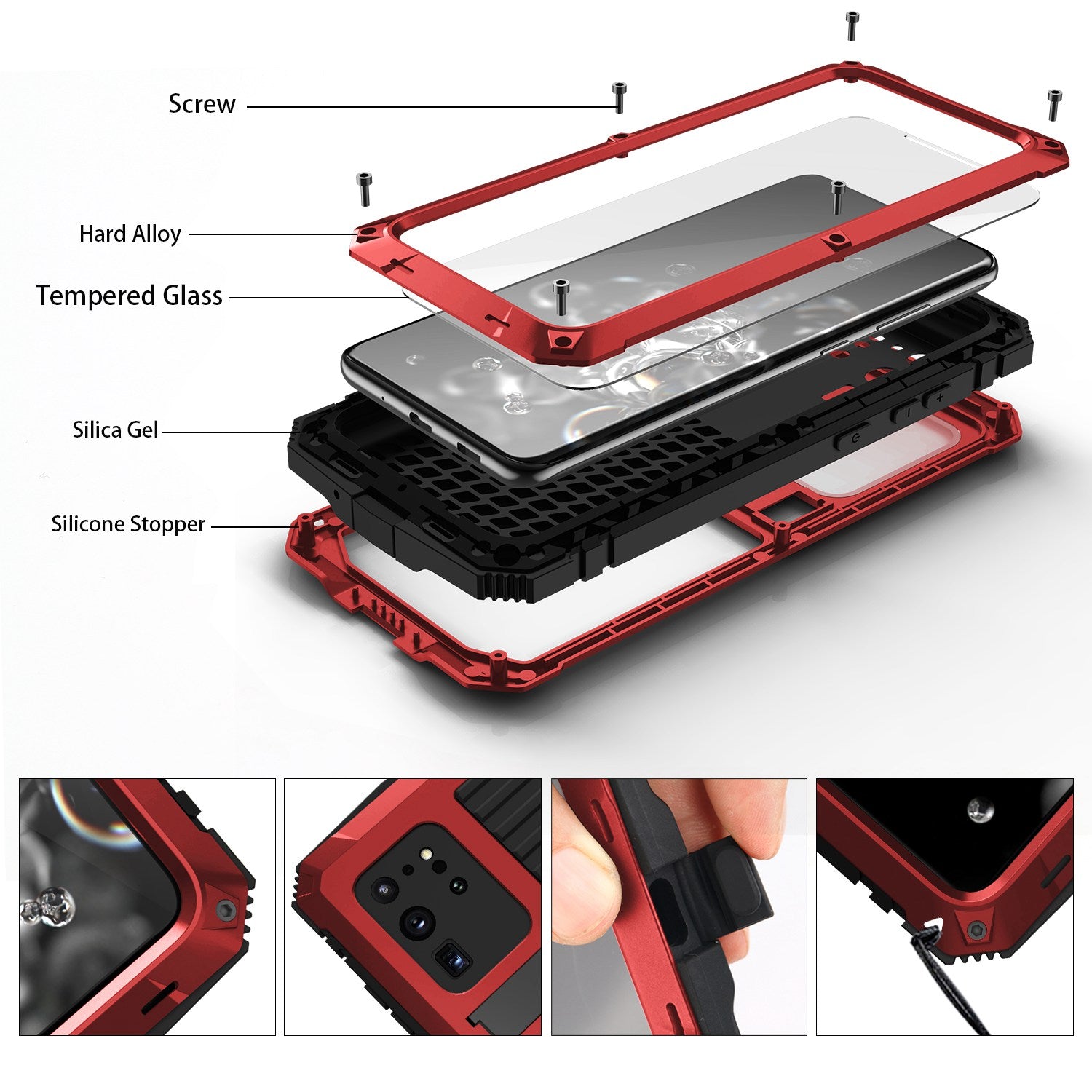 R-JUST For Samsung Galaxy S20 Ultra Metal + Silicone + PC Phone Case Kickstand Full Cover Shell with Tempered Glass Film - Red