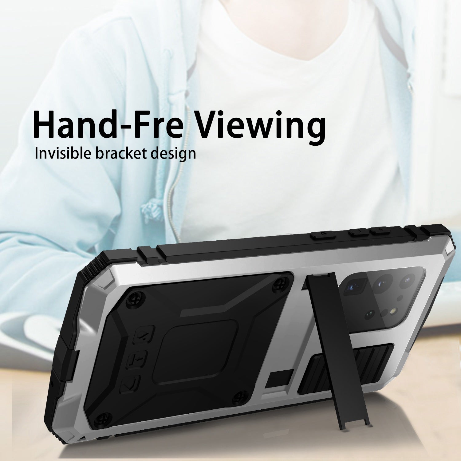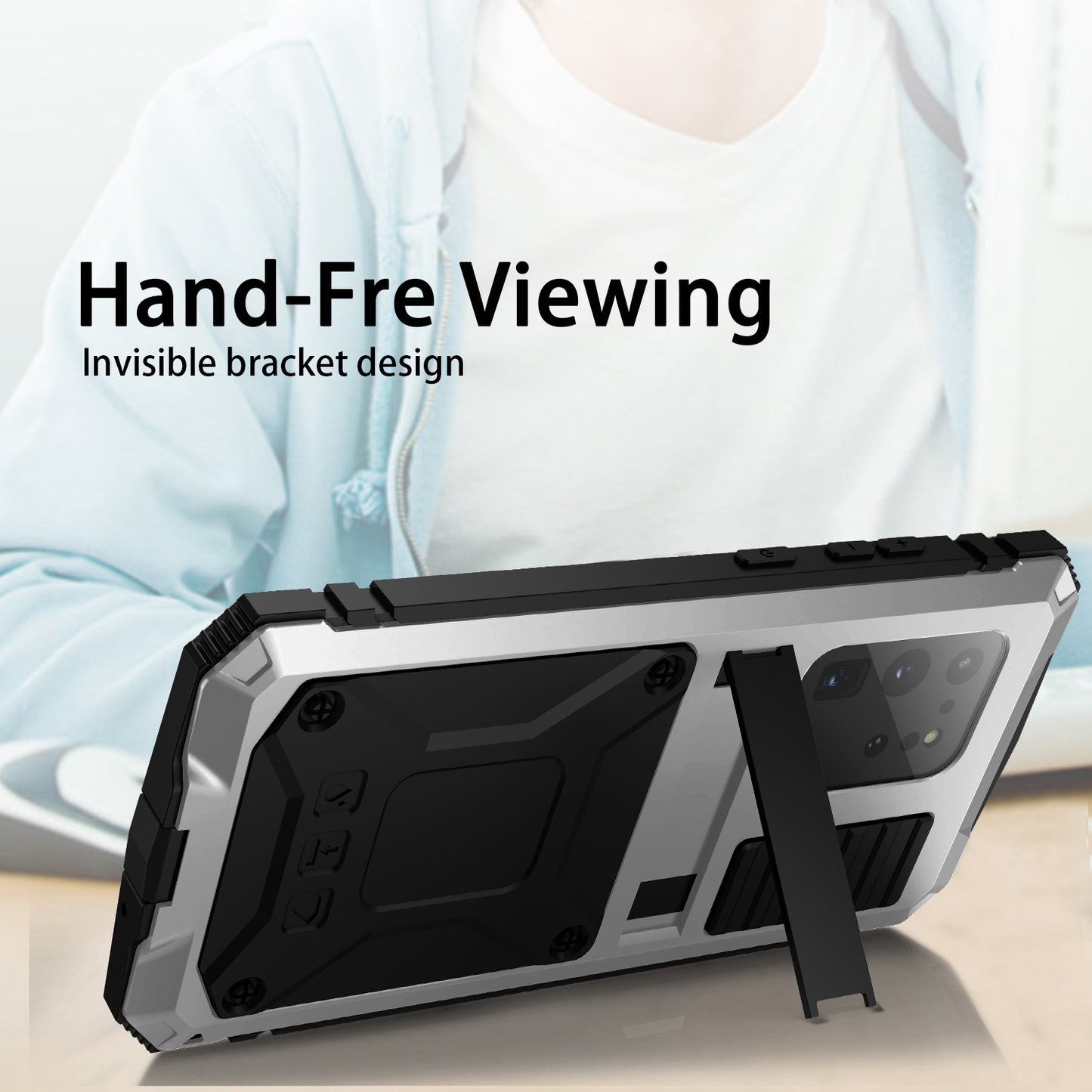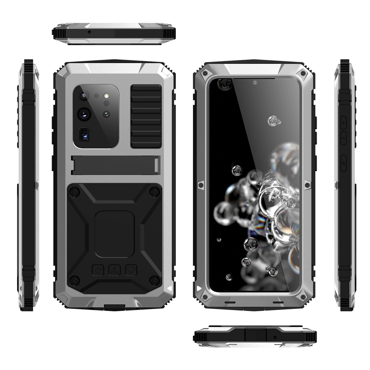 R-JUST For Samsung Galaxy S20 Ultra Metal + Silicone + PC Phone Case Kickstand Full Cover Shell with Tempered Glass Film - Silver