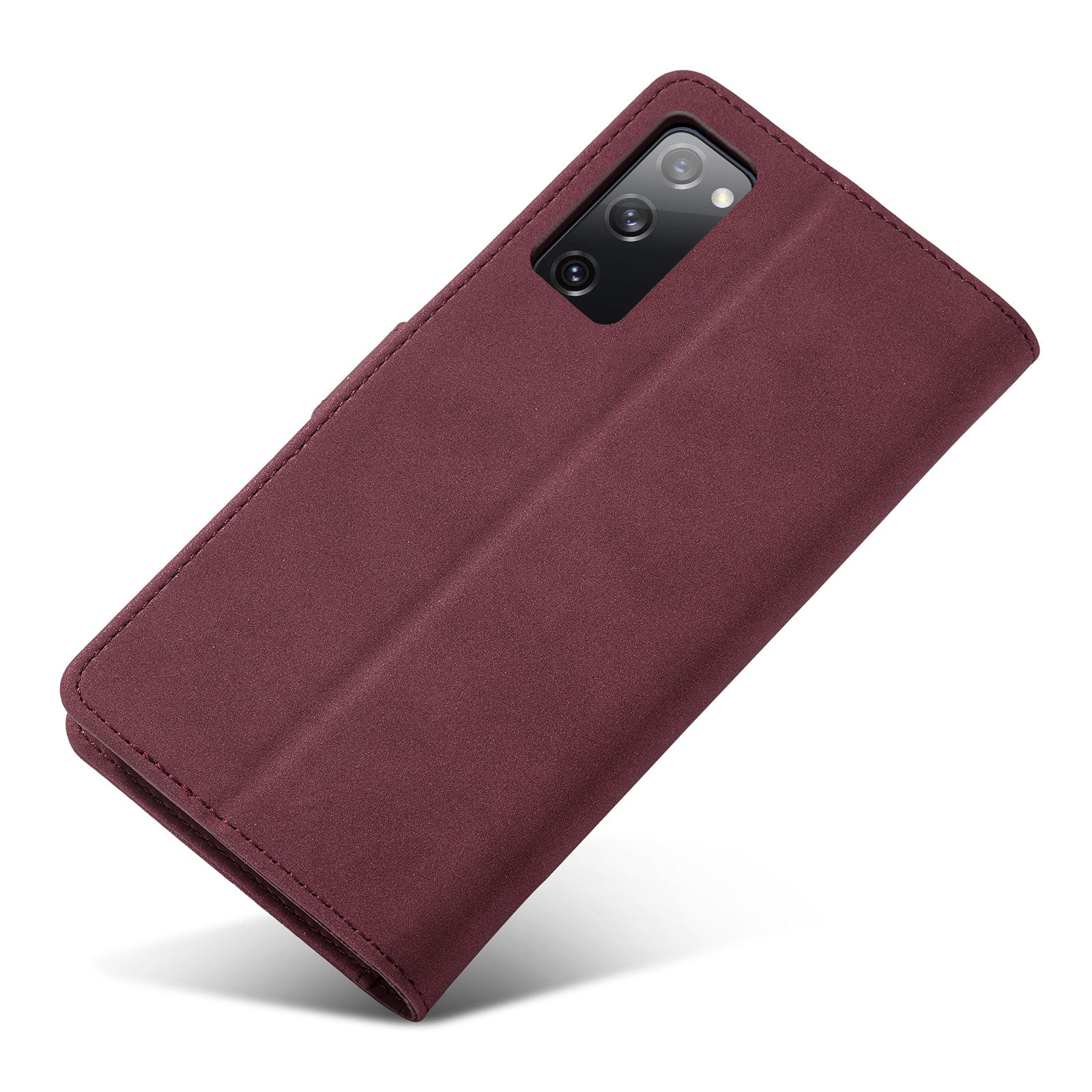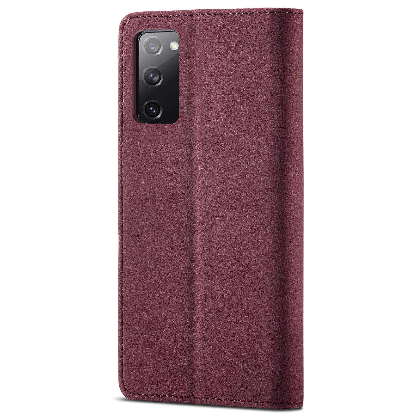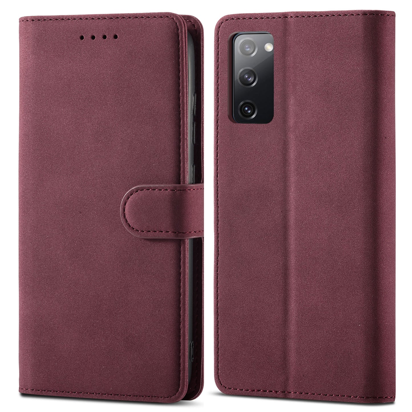 RFID Blocking Anti-scratch Matte Anti-fall PU Leather Stand Wallet Design Phone Case Cover for Samsung Galaxy S20 FE 2022/S20 FE/S20 FE 5G/S20 Lite - Wine Red