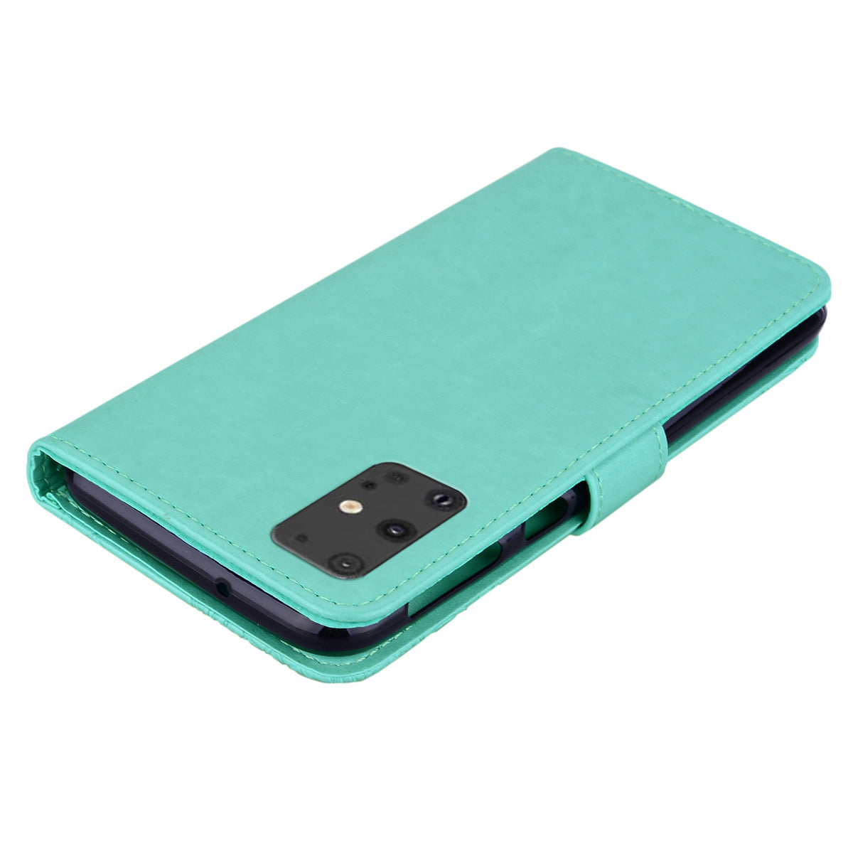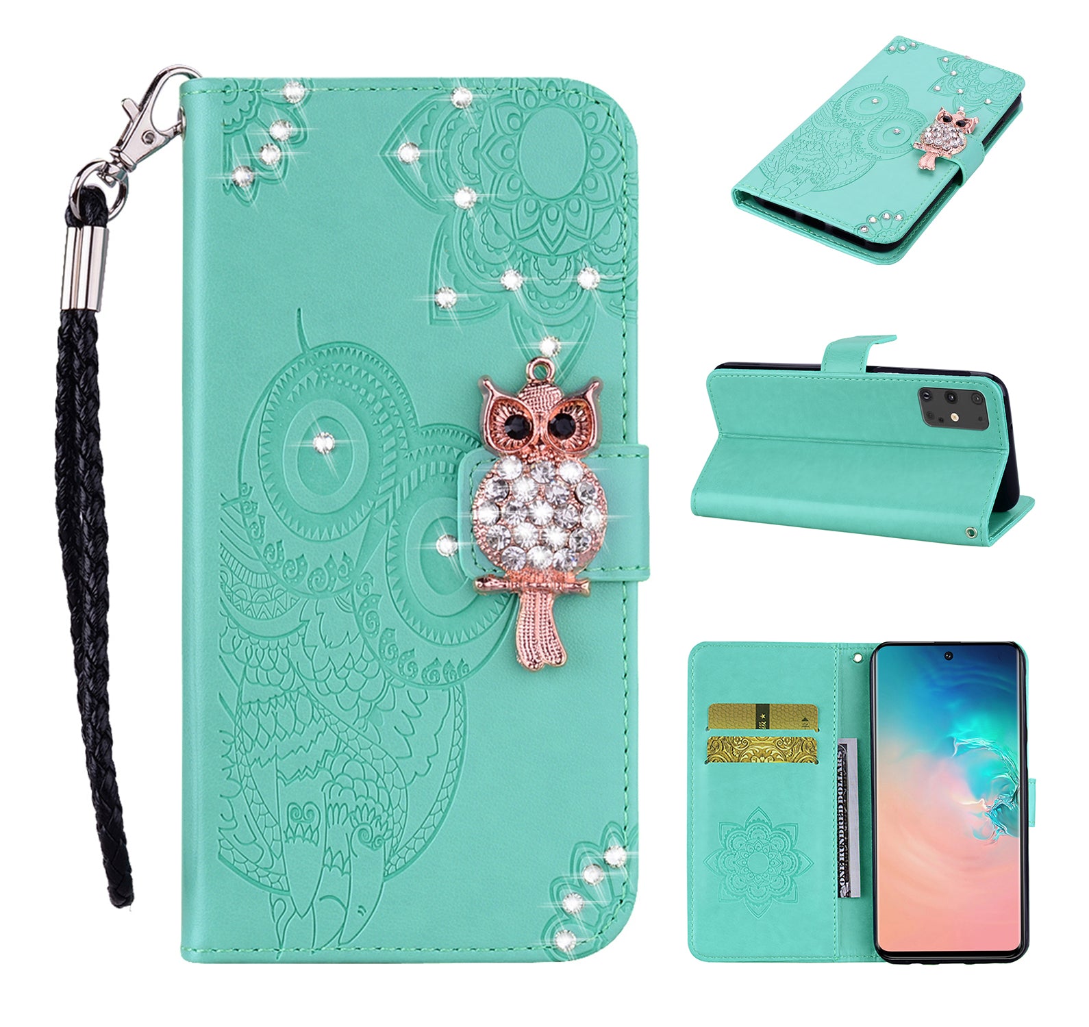 Rhinestone Decoration Imprint Owl Leather Wallet Stand Phone Cover Shell for Samsung Galaxy S20 Ultra - Cyan