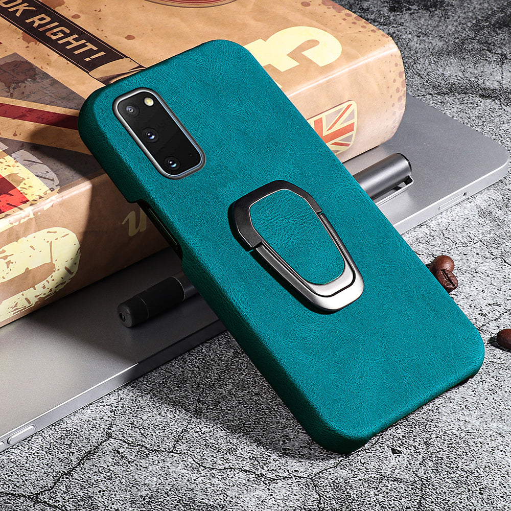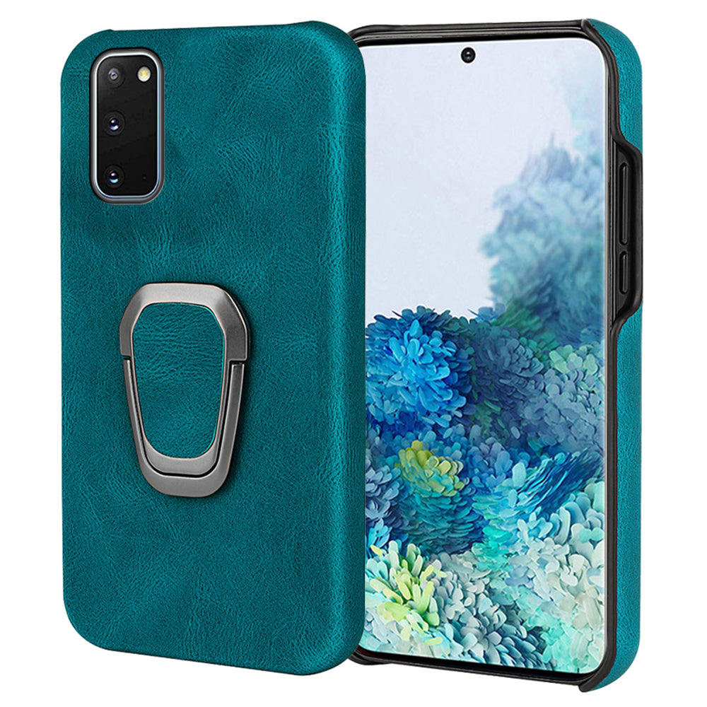 Ring Kickstand PU Leather Coated Hard PC Shockproof Protection Back Cover Shell for Samsung Galaxy S20 4G/S20 5G - Cyan
