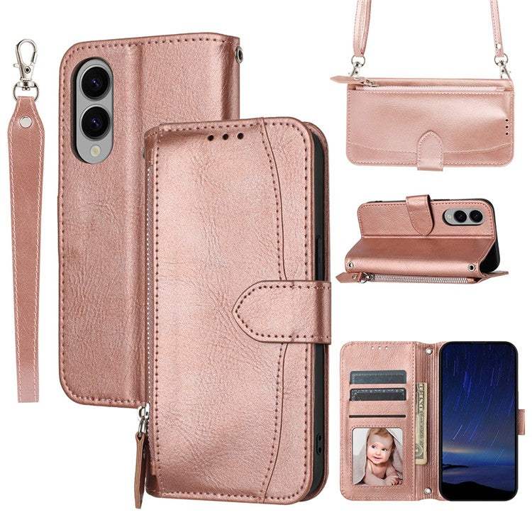 For Samsung Galaxy S25 Edge Case Zipper Pocket Leather Phone Cover with Crossbody Shoulder Strap - Rose Gold