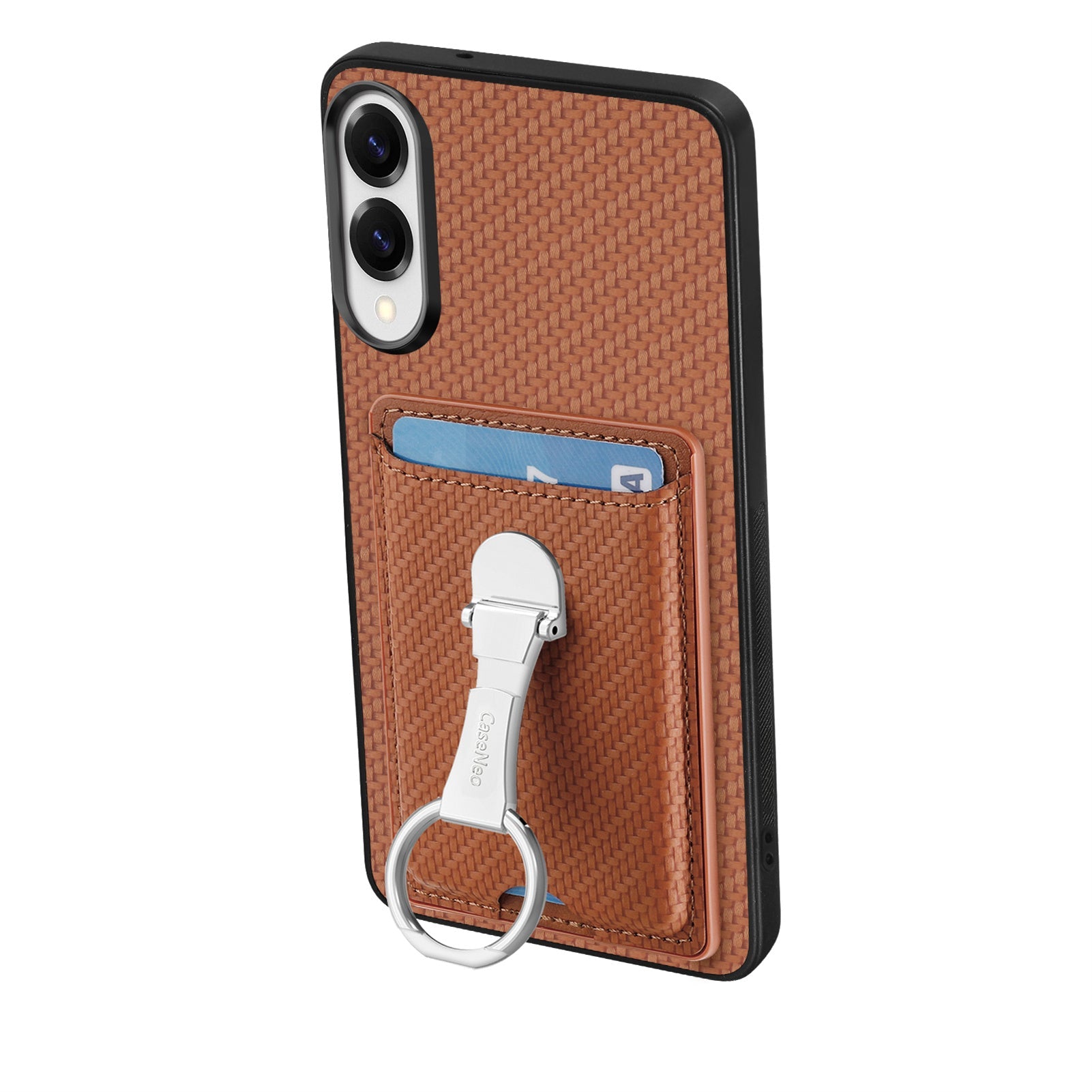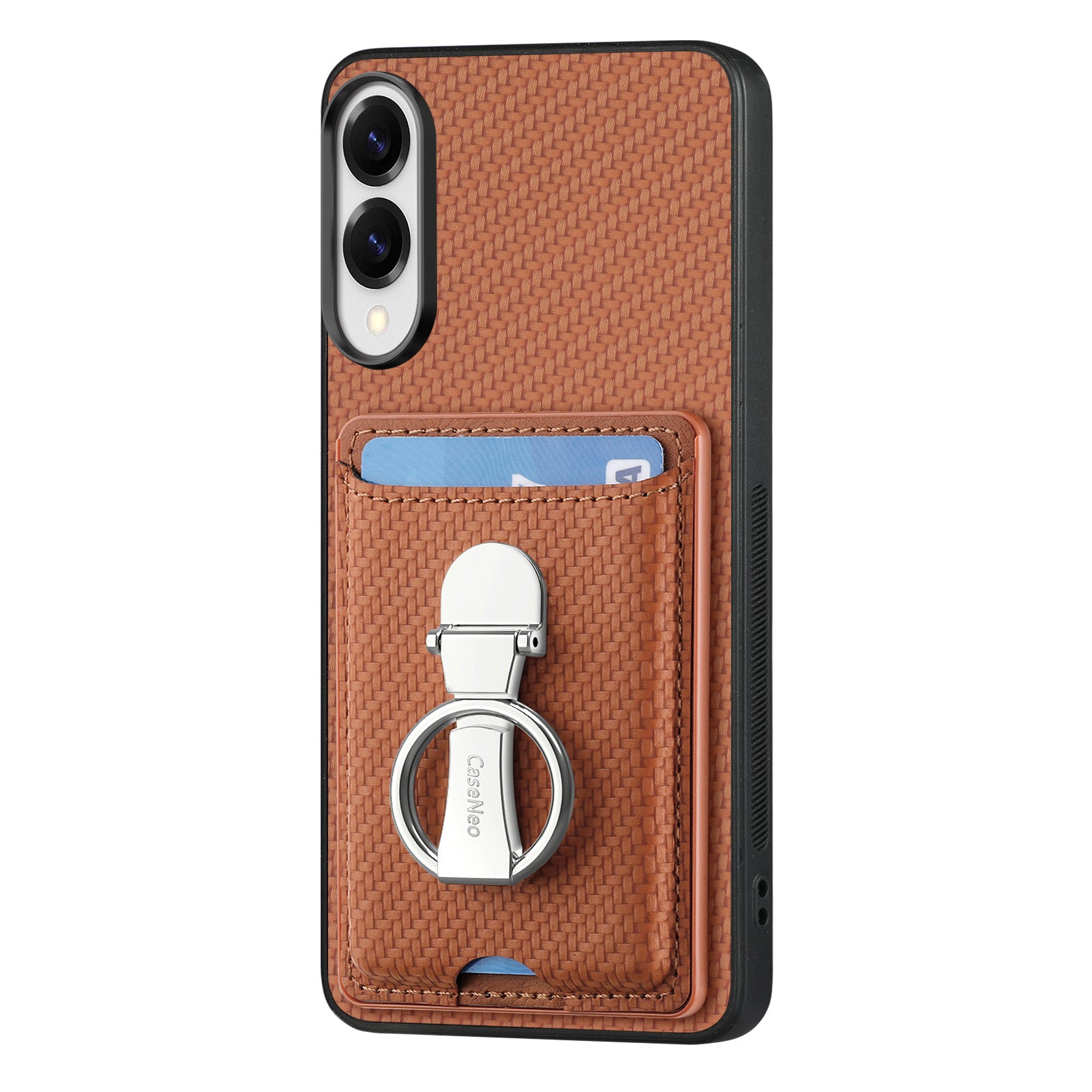 For Samsung Galaxy S25 Edge Leather Phone Back Cover with Kickstand and Card Slots Carbon Fiber Texture - Brown