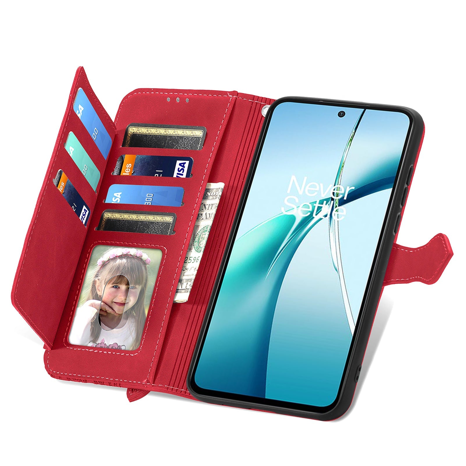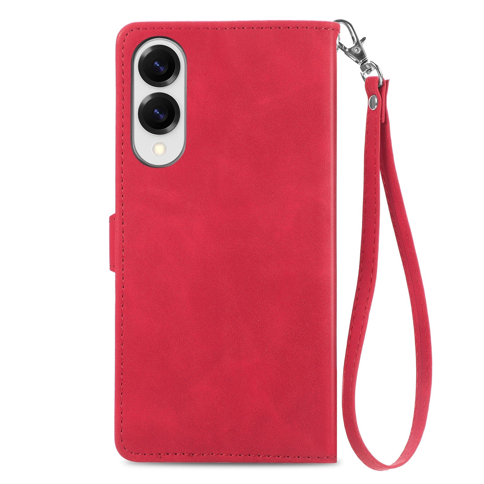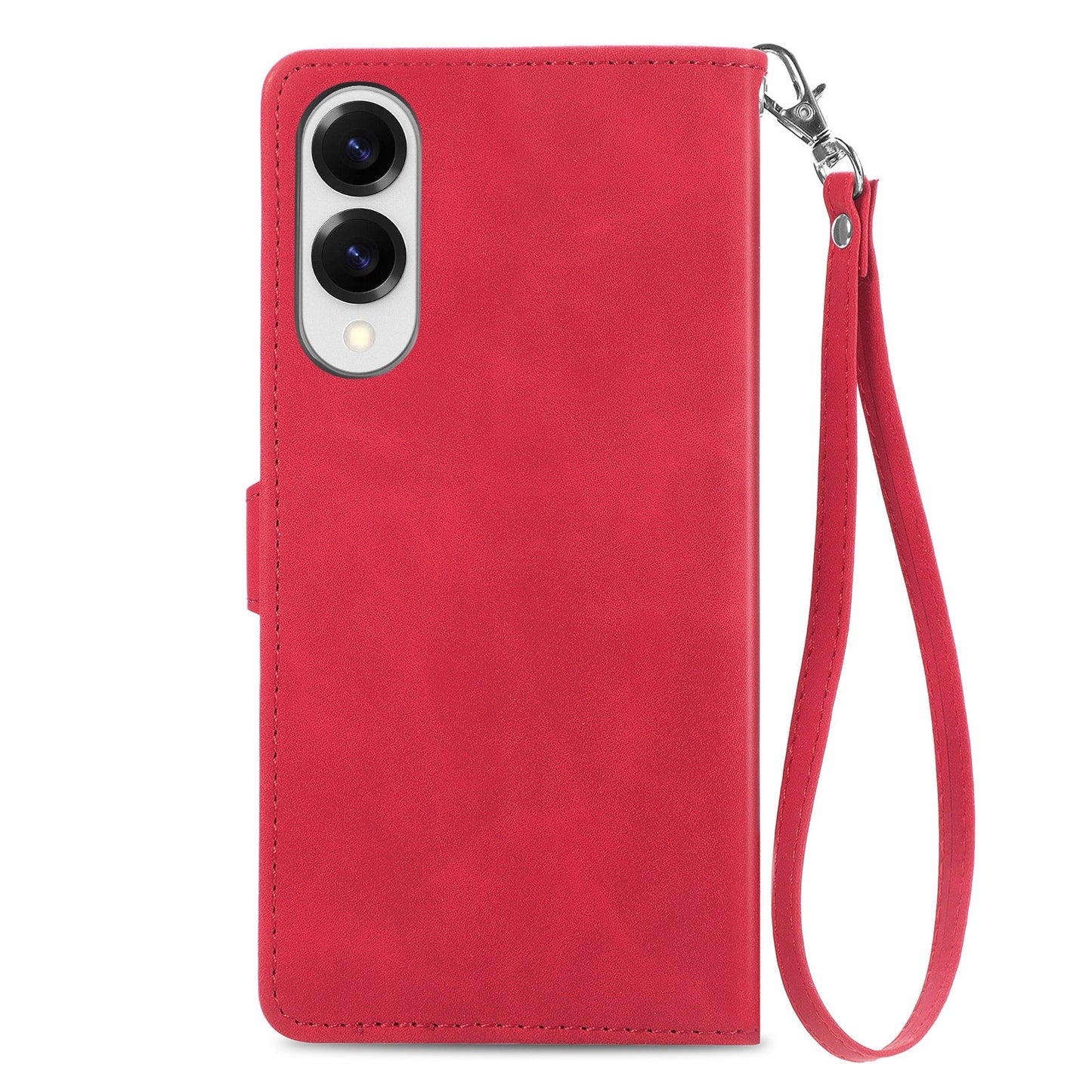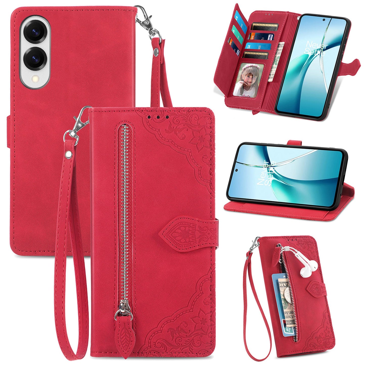 For Samsung Galaxy S25 Edge Zipper Wallet Case with Strap Flower Imprint PU Leather Phone Cover - Red