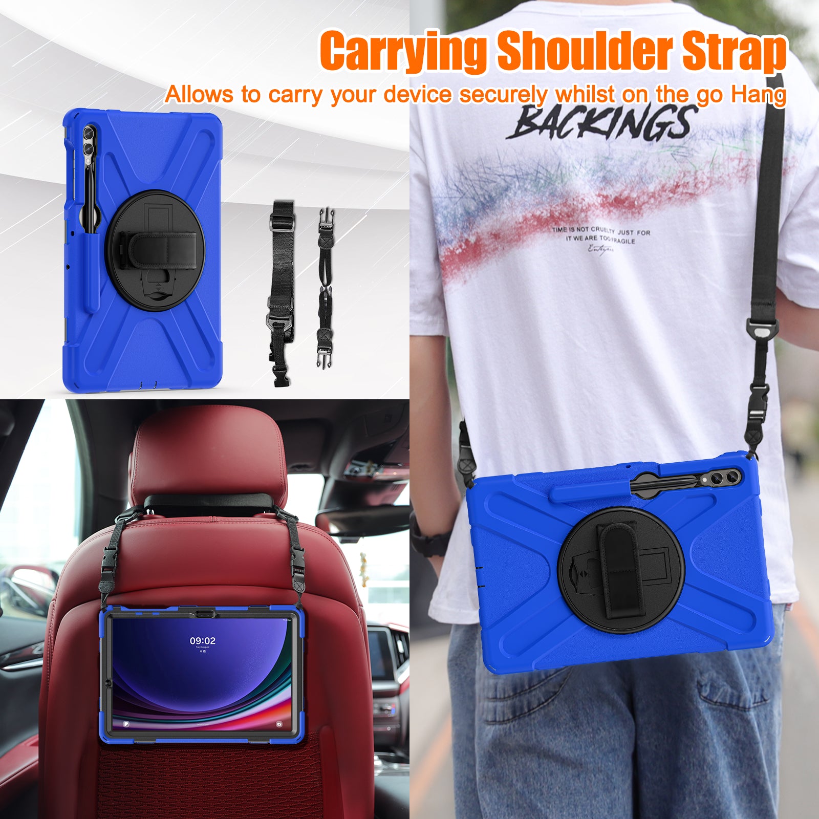 For Samsung Galaxy Tab S10+ X826 / S9 FE+ / S9+ / S8+ / S7+ Shockproof PC+Silicone Rugged Tablet Case Kickstand with Hand Band  /  Shoulder Strap - Blue  /  Black