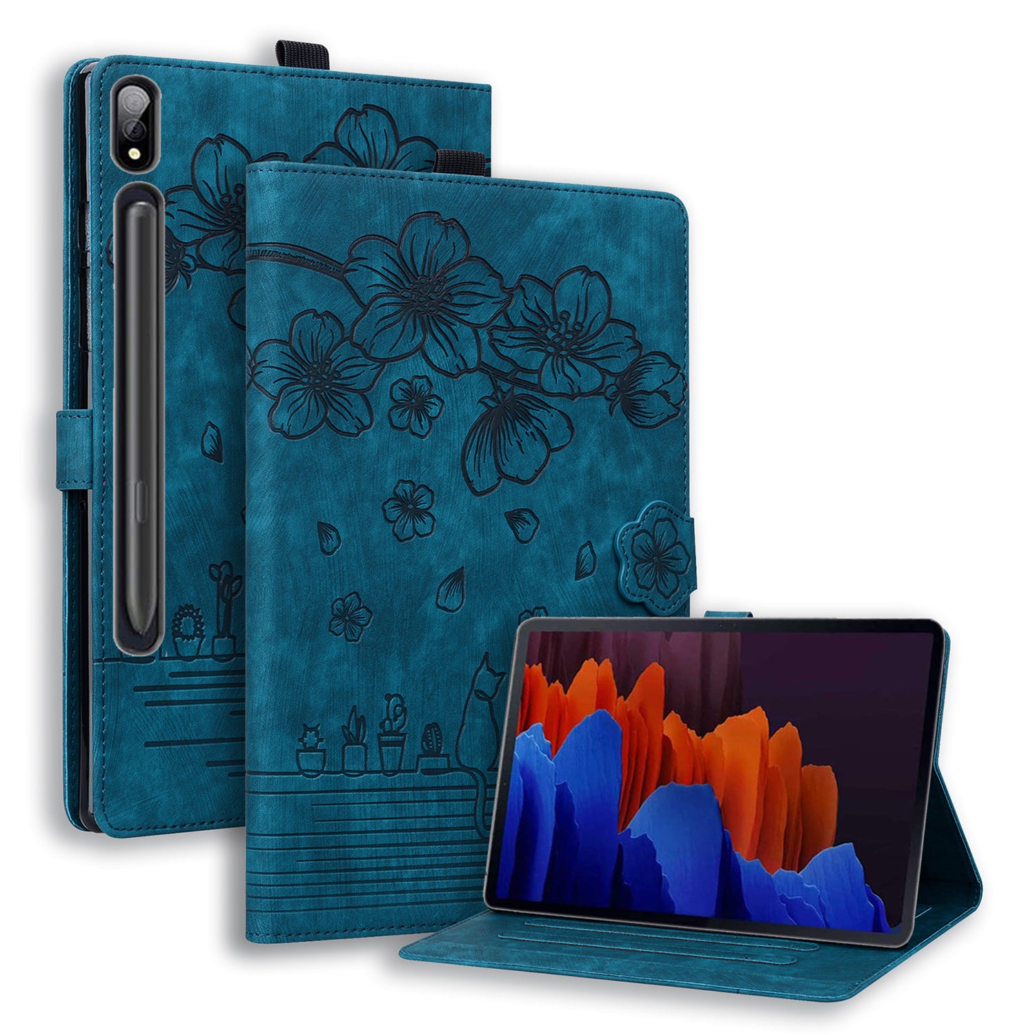 For Samsung Galaxy Tab S9 FE+ Leather Tablet Case Flower Cat Pattern Card Slots Cover - Sapphire