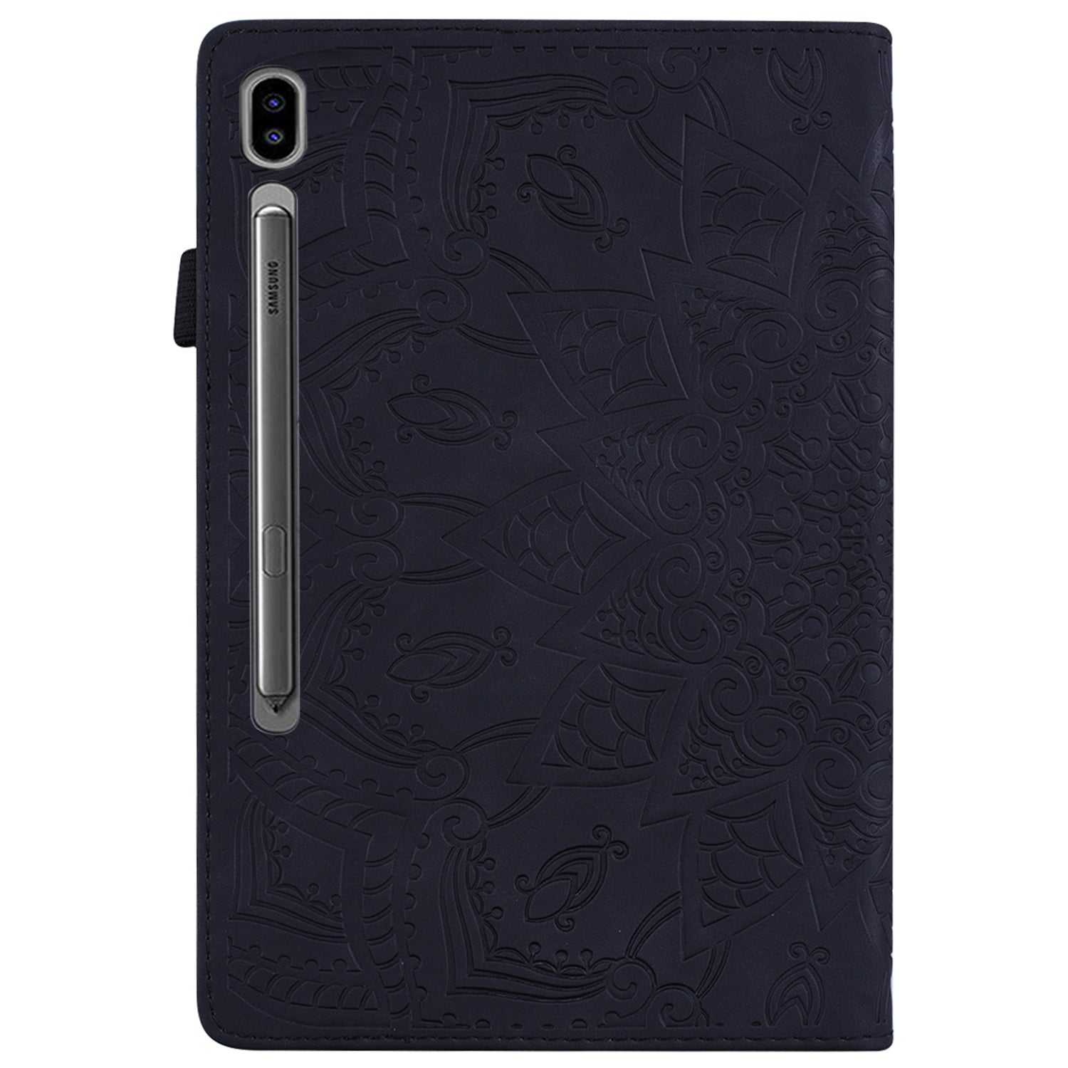 For Samsung Galaxy Tab S9 FE / S9 / S8 / S7 Flower Pattern Imprinting Leather Tablet Stand Cover Shell with Pen Holder Strap - Black