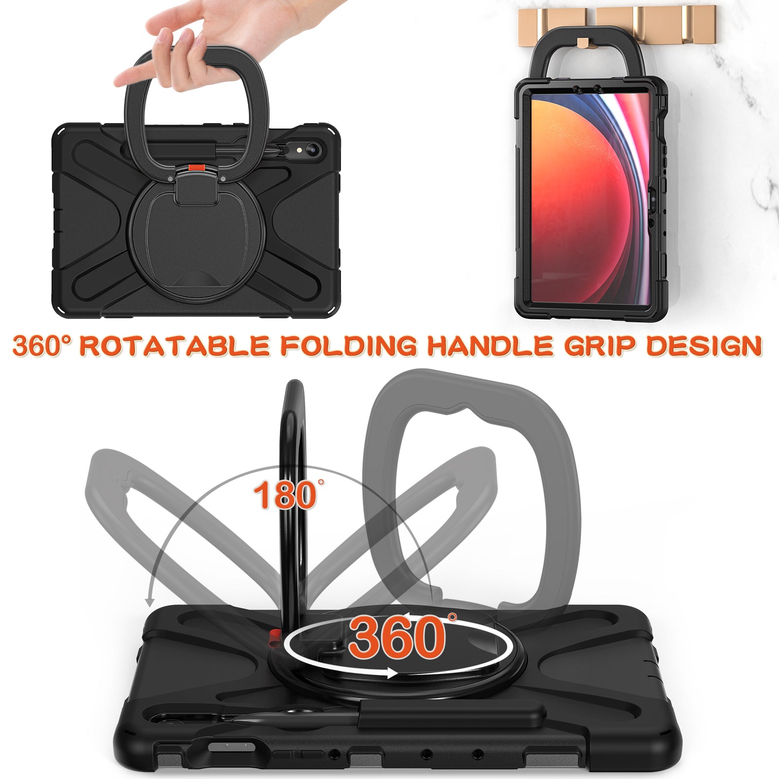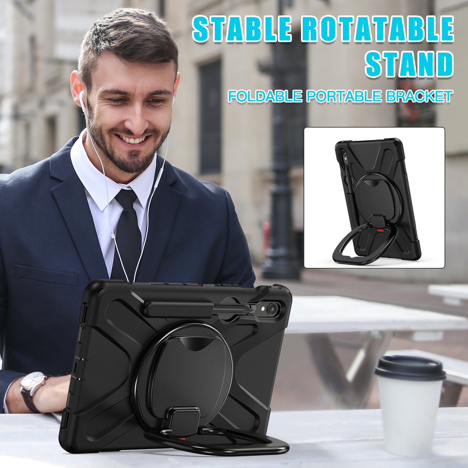 For Samsung Galaxy Tab S9 FE / S9 / S8 / S7 Hard PC+Soft Silicone Case Rotating Kickstand Shockproof Tablet Cover - Black+Black
