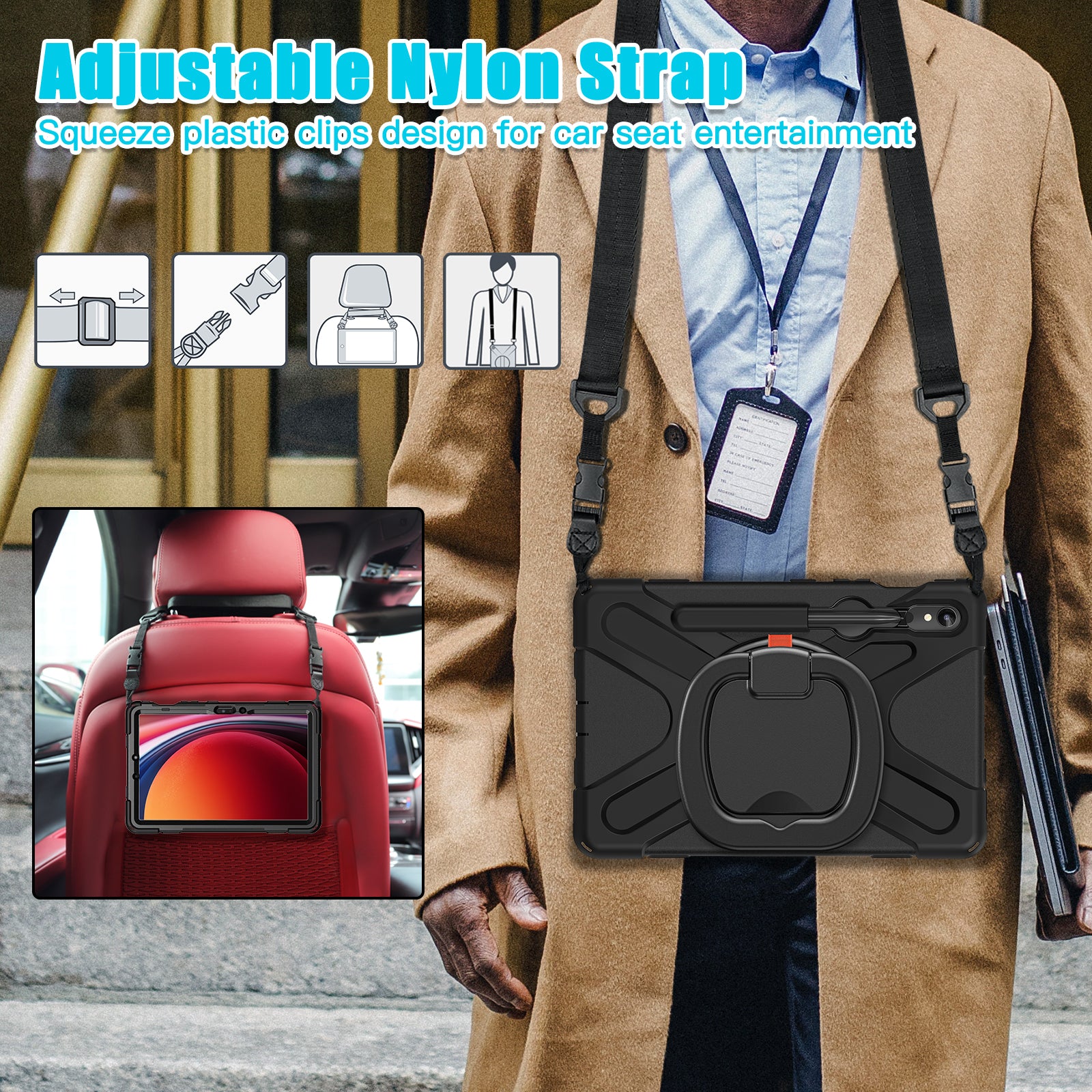 For Samsung Galaxy Tab S9 FE / S9 / S8 / S7 PC+Silicone Protective Case Rotating Kickstand Rugged Tablet Cover with Shoulder Strap - Black+Black