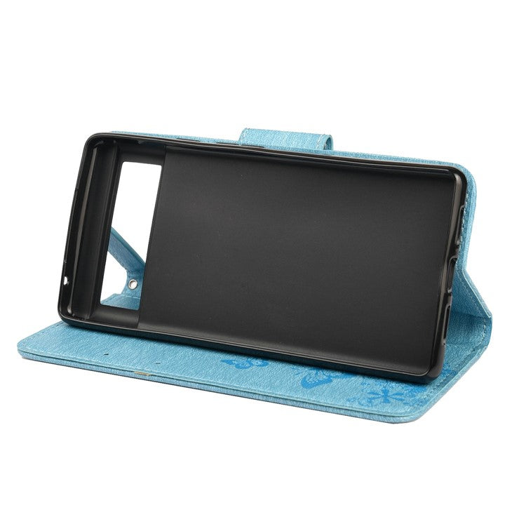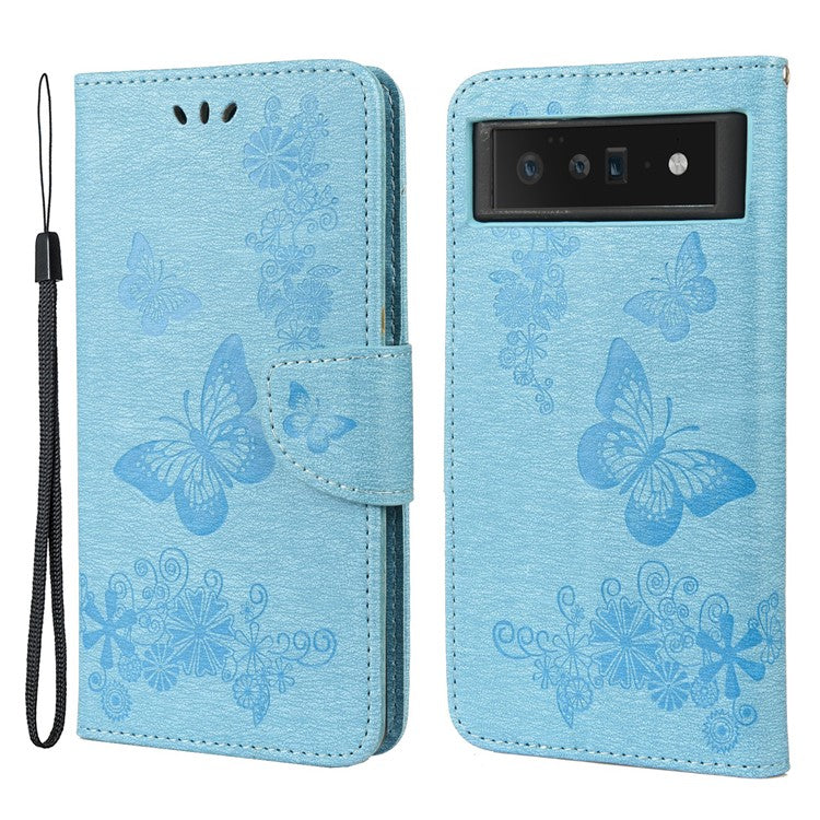 For Google Pixel 6 Pro Imprinted Butterflies Flower Leather Case Wallet Stand Phone Cover Shell - Blue
