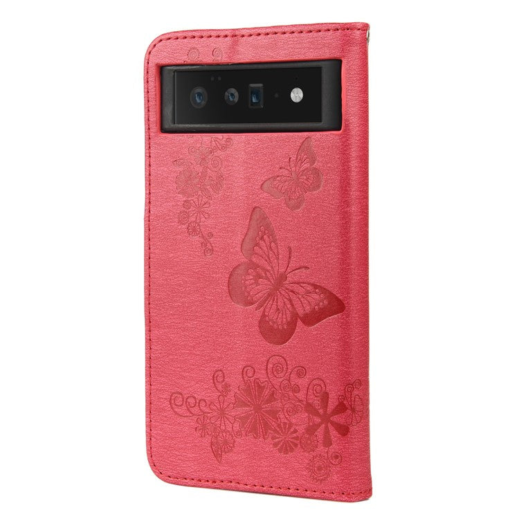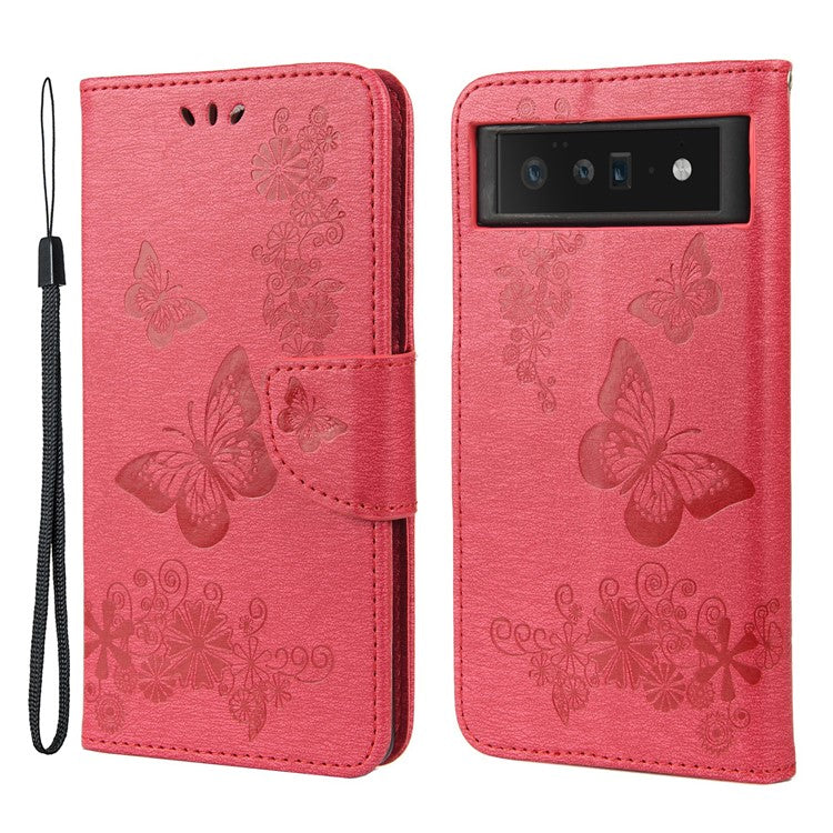 For Google Pixel 6 Pro Imprinted Butterflies Flower Leather Case Wallet Stand Phone Cover Shell - Red