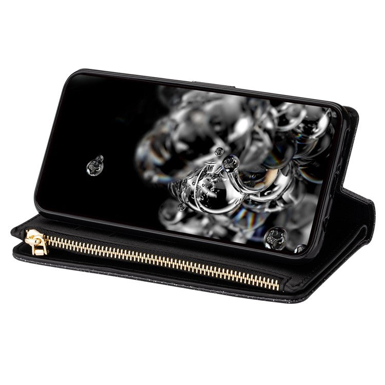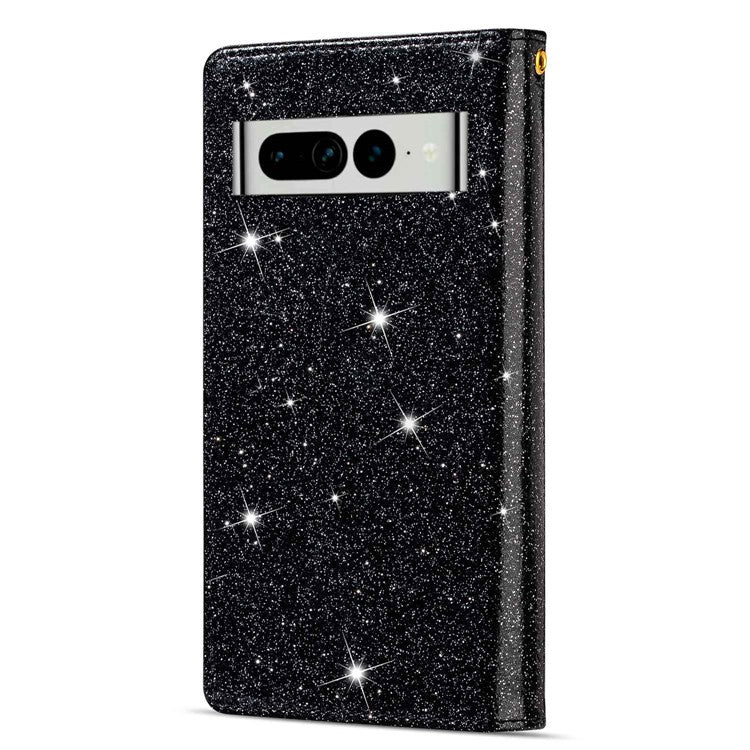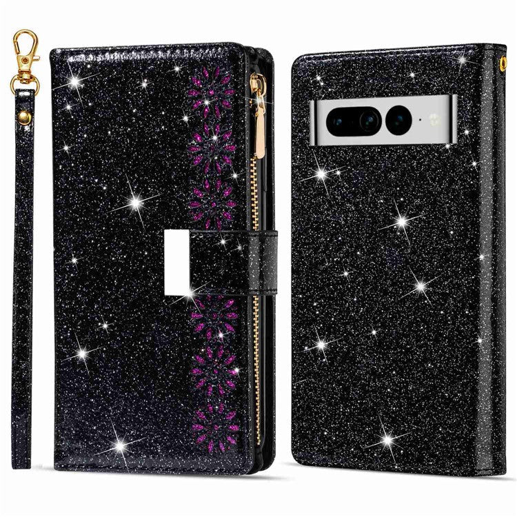 For Google Pixel 7 Pro 5G Zipper Wallet Stand PU Leather Phone Case Flip Laser Carving Glittery Starry Style Shockproof Phone Cover with Strap - Black
