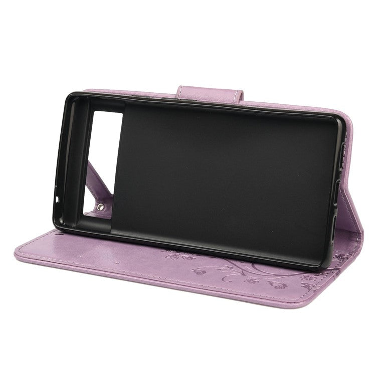 Full Protection Imprint Butterflies Flower Pattern Leather Phone Stand Wallet Case Cover for Google Pixel 6 - Light Purple