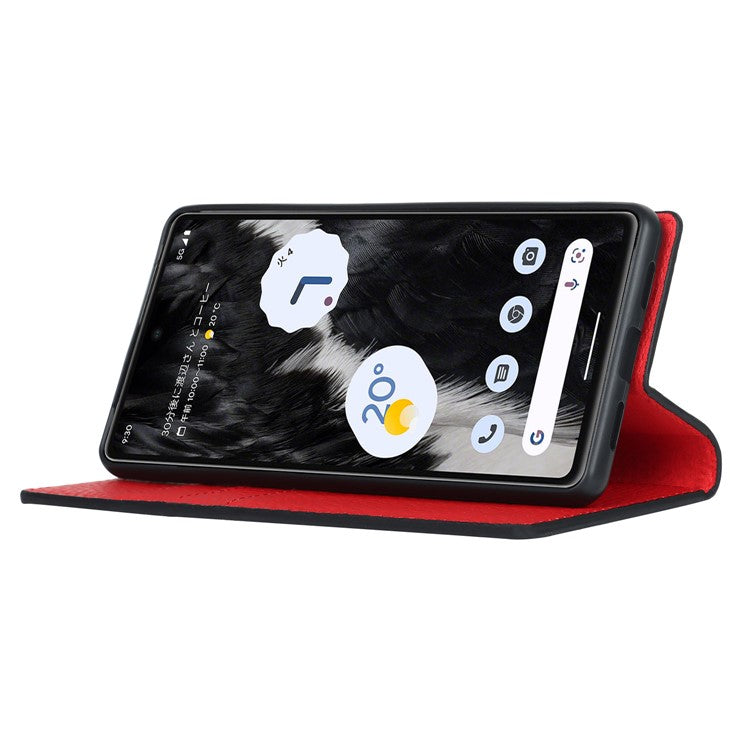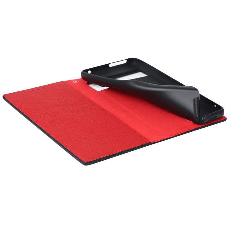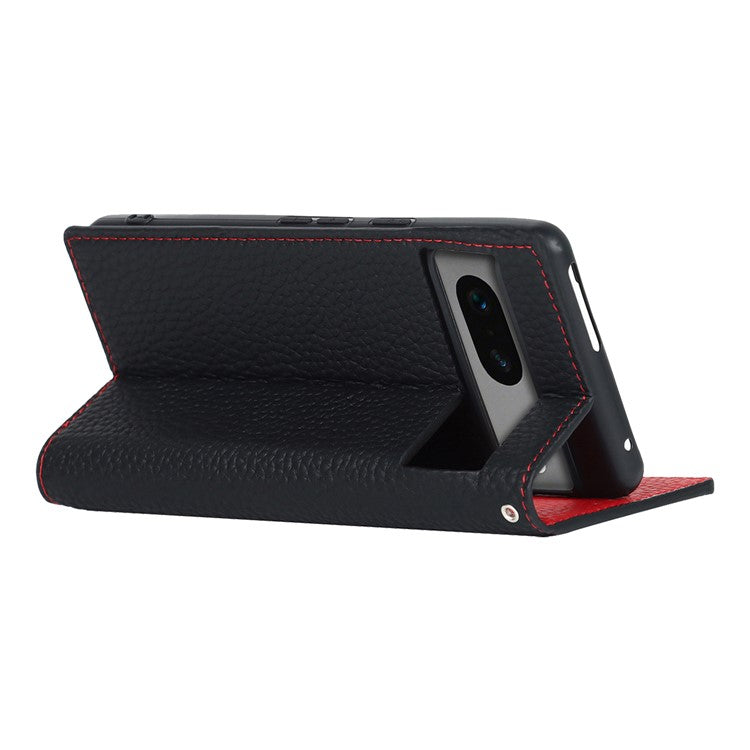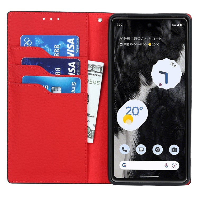 Genuine Leather Phone Case for Google Pixel 7a , Litchi Texture Wallet Stand Smartphone Cover with Strap - Black