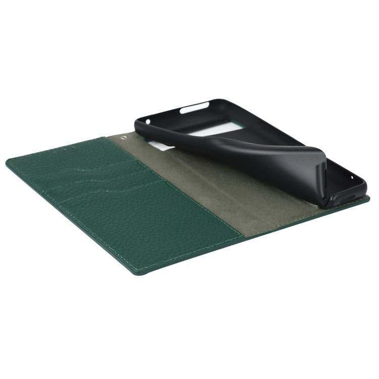Genuine Leather Phone Case for Google Pixel 7a , Litchi Texture Wallet Stand Smartphone Cover with Strap - Green