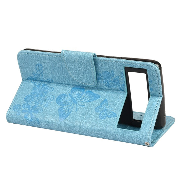 Imprinted Butterflies Flower Shockproof Leather Phone Case Shell with Wallet Stand for Google Pixel 6 - Blue