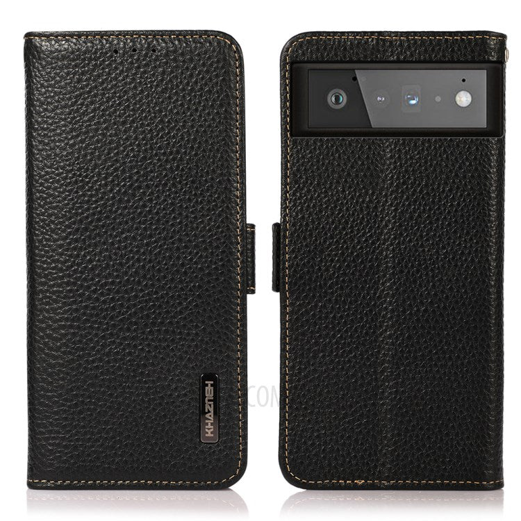 KHAZNEH For Google Pixel 6 Genuine Leather Case Litchi Texture Anti-theft Swiping Design Wallet Phone Protector with Stand - Black