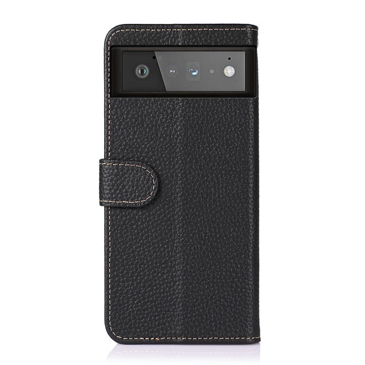 KHAZNEH Litchi Texture Top Layer Genuine Leather Phone Wallet Stand Case Protector for Google Pixel 6 - Black