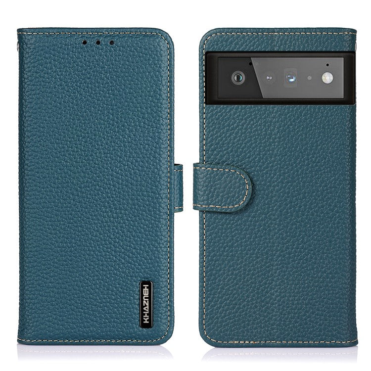 KHAZNEH Litchi Texture Top Layer Genuine Leather Phone Wallet Stand Case Protector for Google Pixel 6 - Green