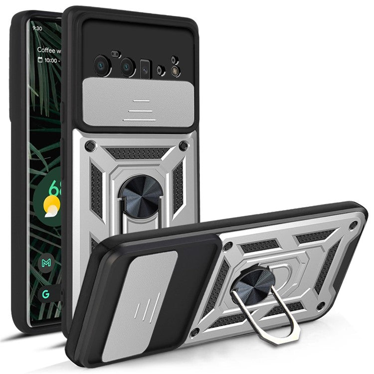 Ring Holder Kickstand Case Anti-scratch Camera Slide Cover Design PC + TPU Phone Shell Cover for Google Pixel 6 Pro - Silver