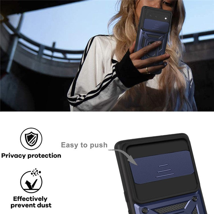 Ring Kickstand Design Anti-scratch Anti-fingerprint Camera Slide Cover PC + TPU Anti-fall Hybrid Case Cover for Google Pixel 6 - Blue