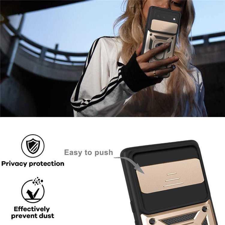 Ring Kickstand Design Anti-scratch Anti-fingerprint Camera Slide Cover PC + TPU Anti-fall Hybrid Case Cover for Google Pixel 6 - Gold