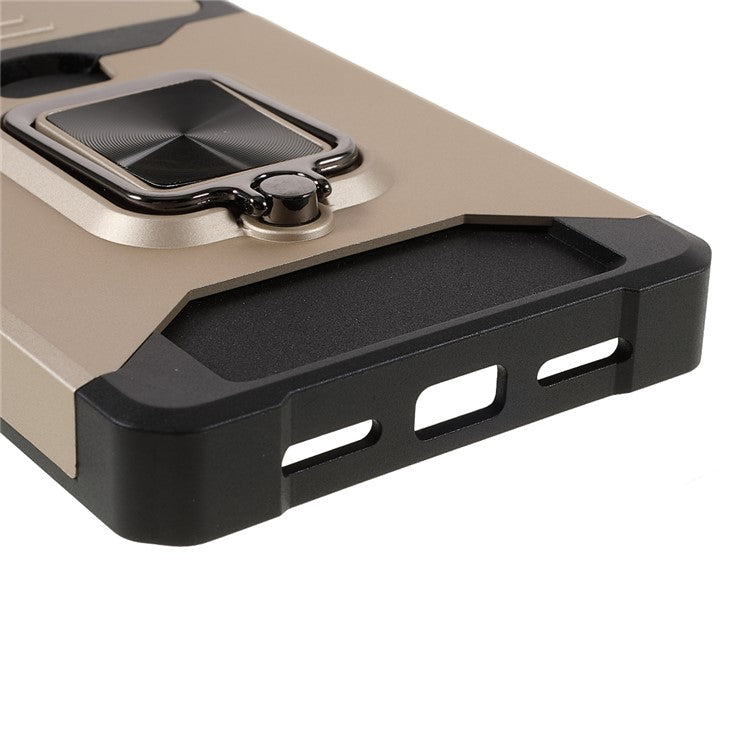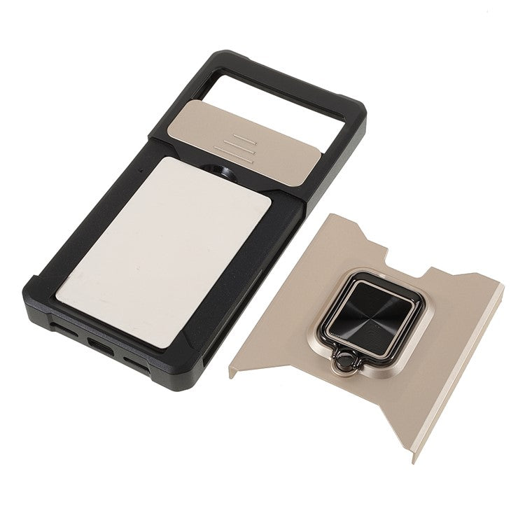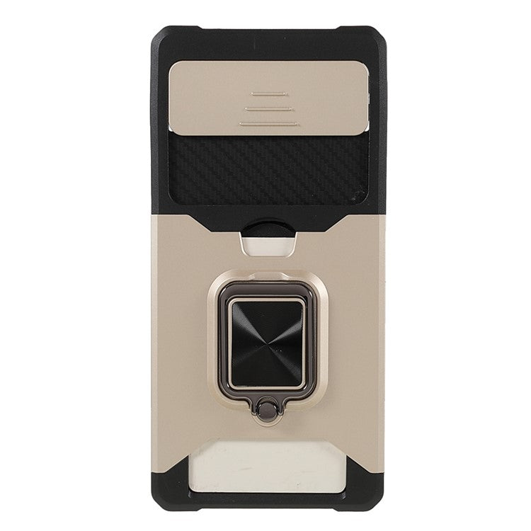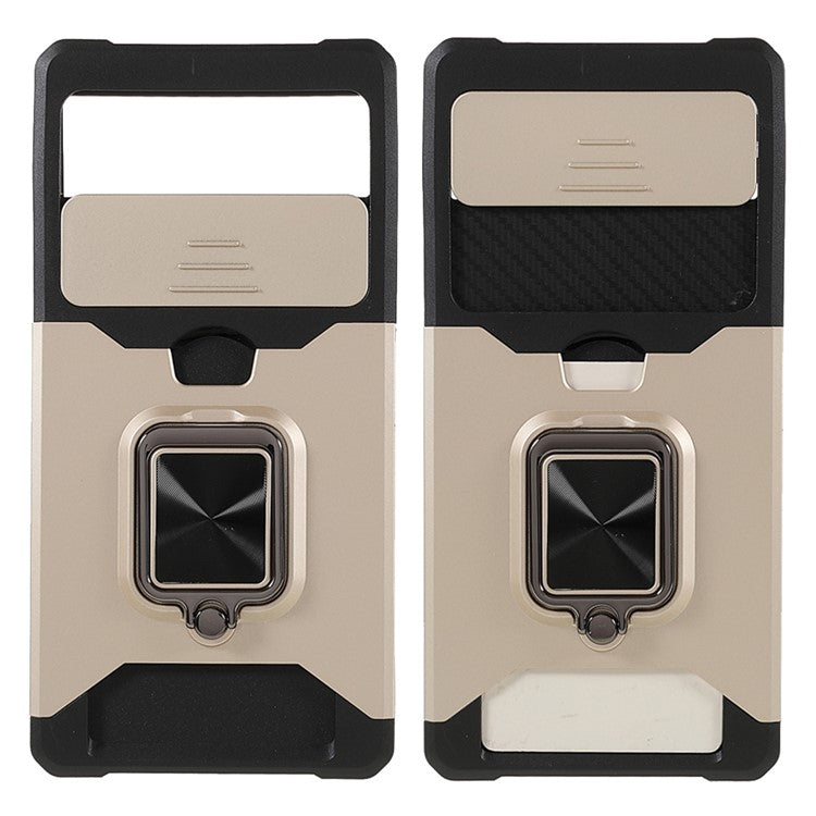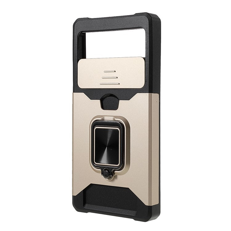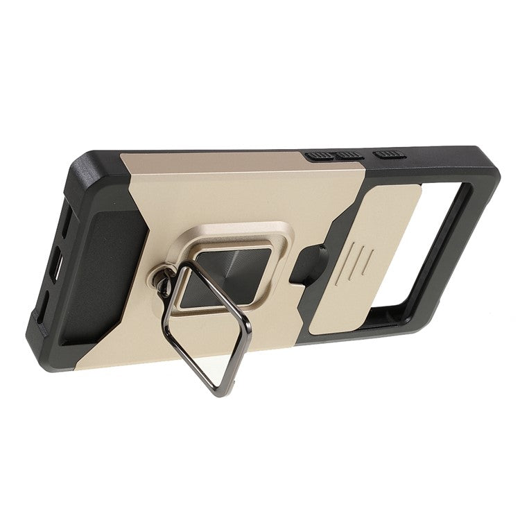Ring Kickstand Hard PC + TPU 2-in-1 Shockproof Protective Case with Slide Camera Cover and Card Holder for Google Pixel 6 - Gold