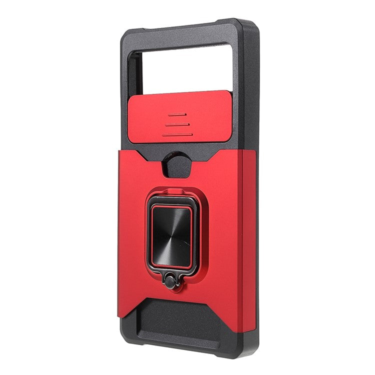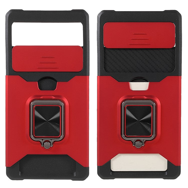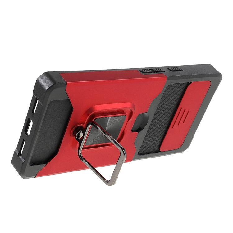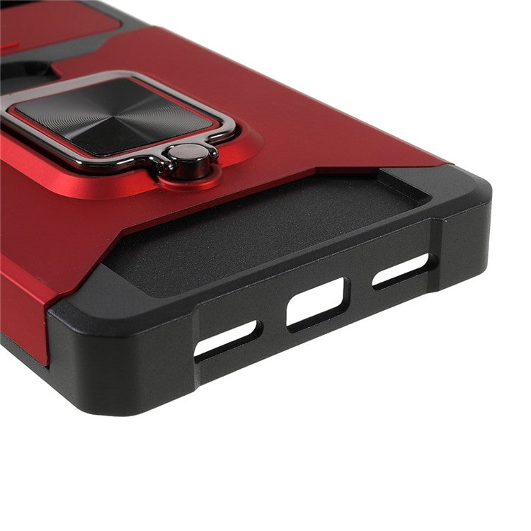 Ring Kickstand Hard PC + TPU 2-in-1 Shockproof Protective Case with Slide Camera Cover and Card Holder for Google Pixel 6 - Red