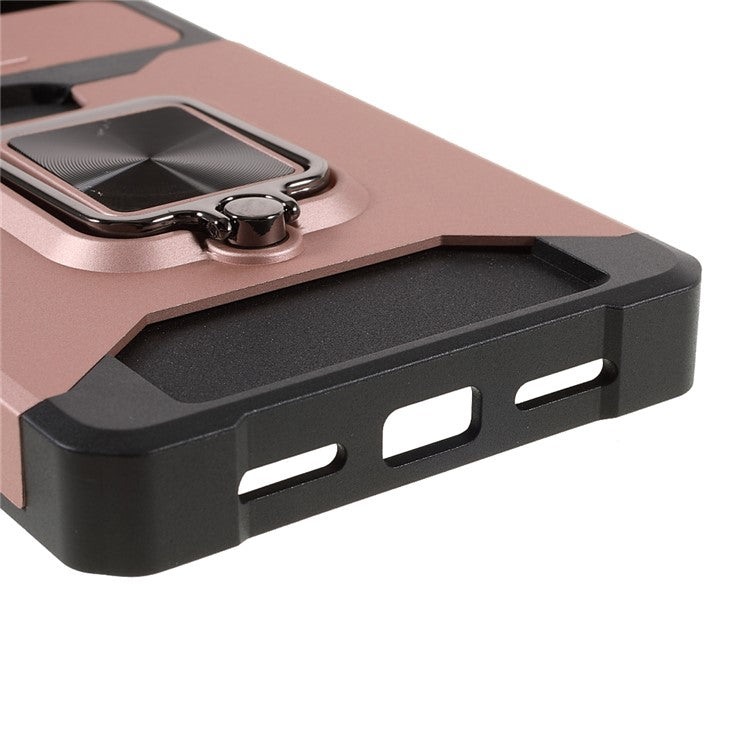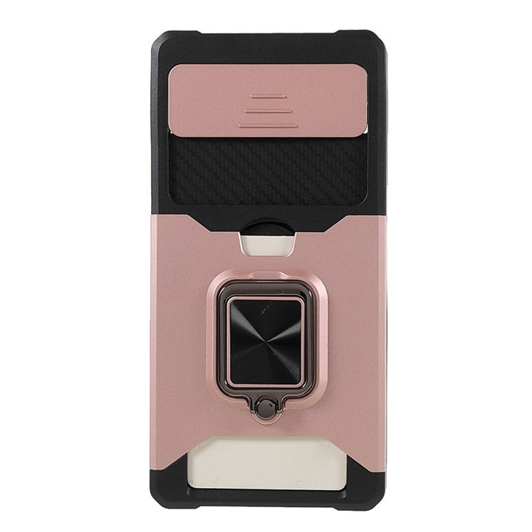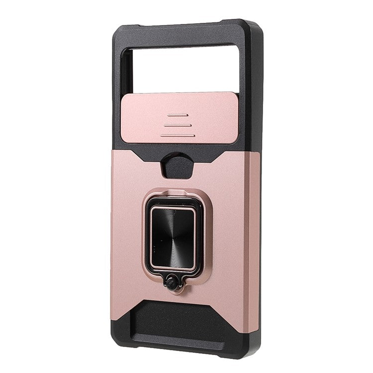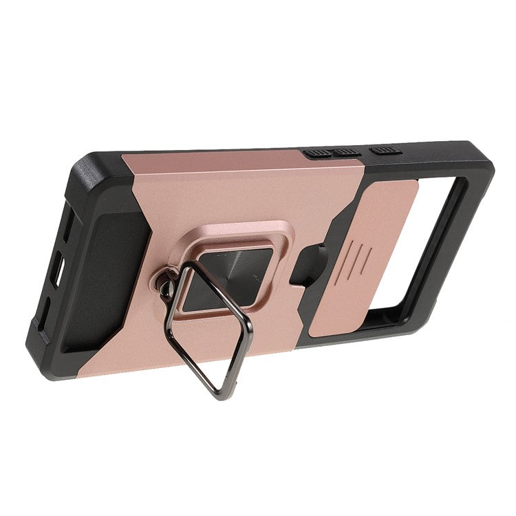 Ring Kickstand Hard PC + TPU 2-in-1 Shockproof Protective Case with Slide Camera Cover and Card Holder for Google Pixel 6 - Rose Gold
